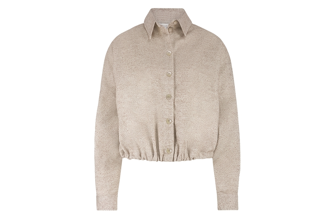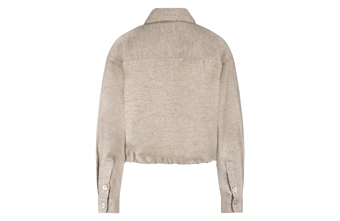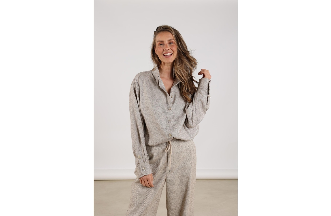 NUKUS Lara Blouse Strass 9 sand. Dit rechtvallend model is voorzien van een kraag en heeft lange mouwen. Deze zandkleurige jacket van Nukus sluit door middel van knopen en is bewerkt met strass-steentjes. Dit model is onderdeel van een co-ord set.