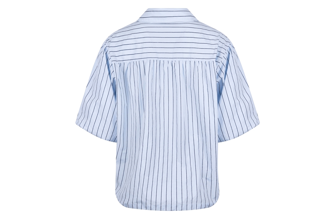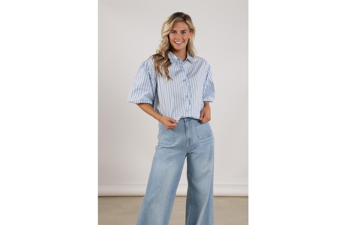 NUKUS Leia Blouse Stripe 312 cloudy. Dit rechtvallende model is voorzien van een kraag en heeft korte pofmouwen. Deze lichtblauwe blouse van Nukus sluit door middel van knopen en is bewerkt met een subtiele glitter streeppatroon in het donker blauw. Aan de onderkant van de blouse zit elastiek die verstelbaar is.