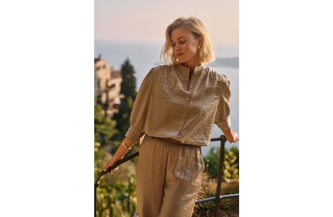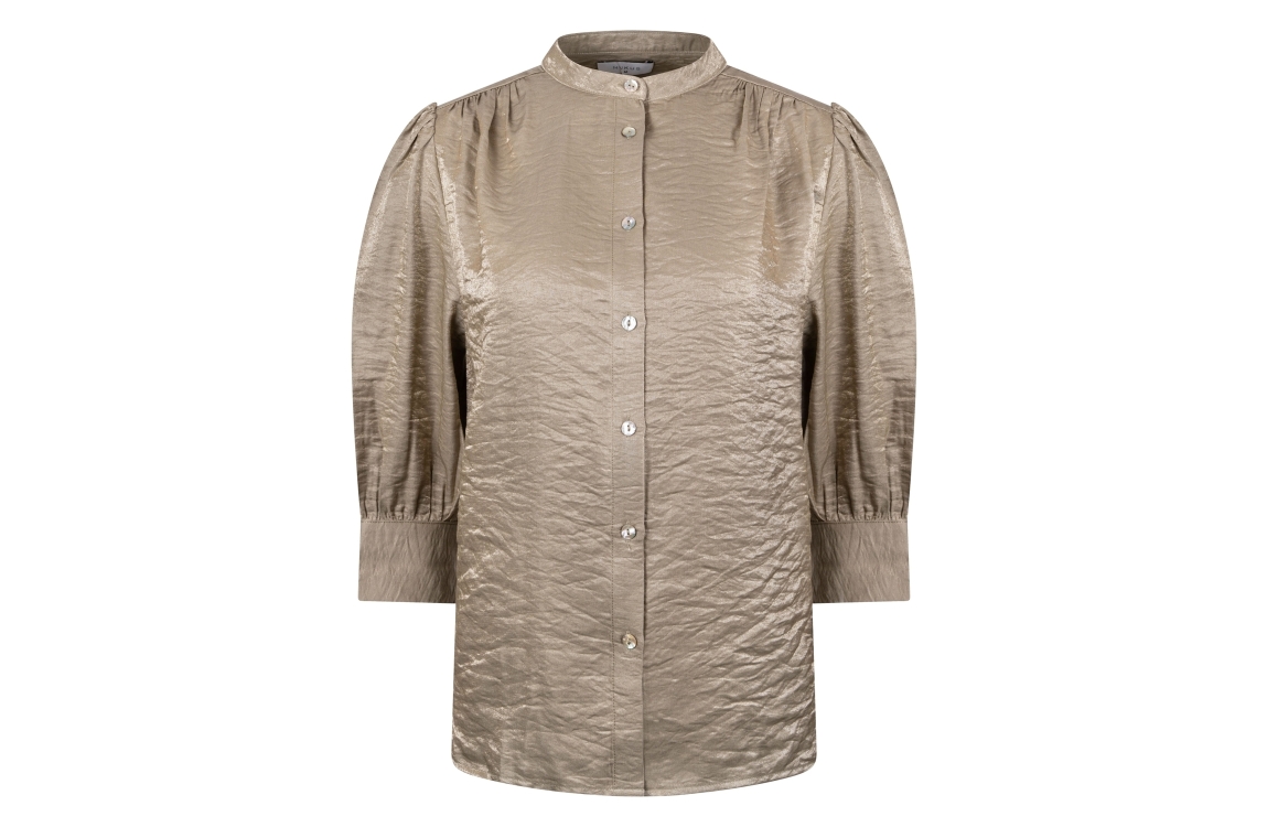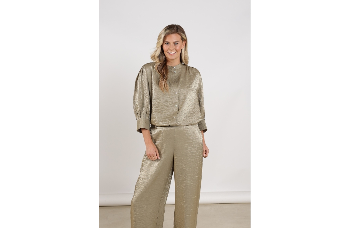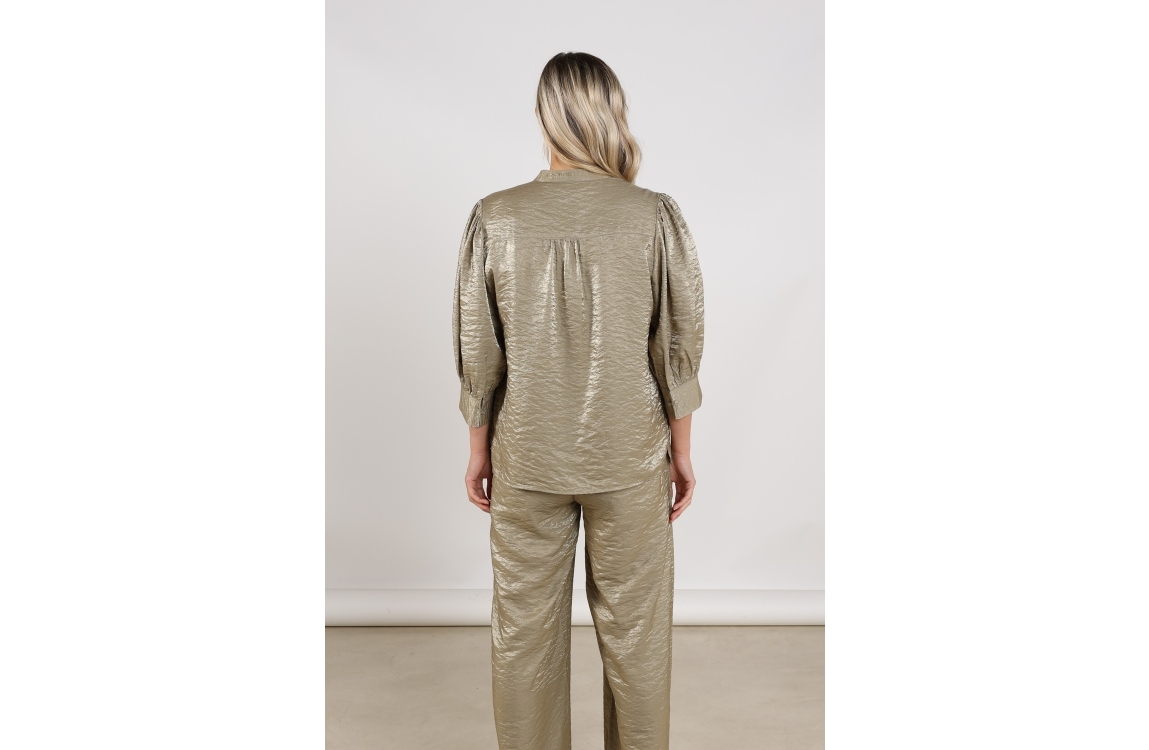 NUKUS Lilly Blouse Shiny 350 army. Dit soepelvallende model is voorzien van een ronde hals en driekwart mouwen. Deze groene blouse van Nukus sluit door middel van knopen en is bewerkt met een subtiele glans. Combineer deze blouse met de Linsey pants voor een set.