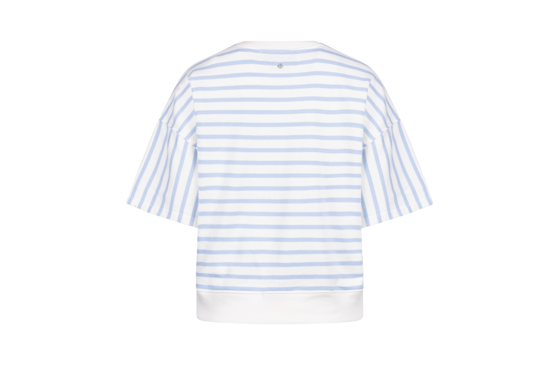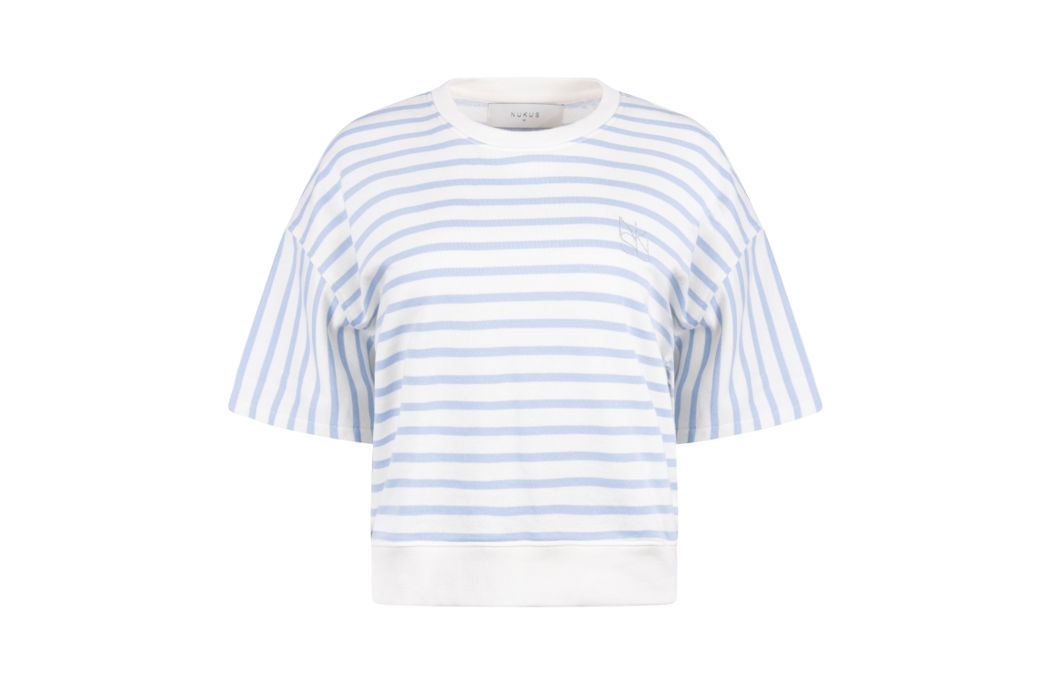 NUKUS Lotte Pullover Stripe 315 offwhite/cloudy. Dit rechtvallende model is voorzien van een ronde hals en heeft korte mouwen. Deze witte top van Nukus is all-over bewerkt met een lichtblauw strepen patroon. Dit model is afgewerkt met ribboorden en het Nukus logo op de borst.