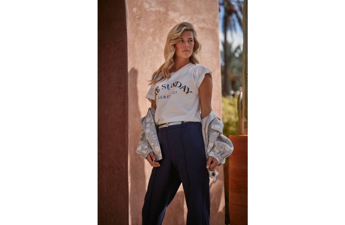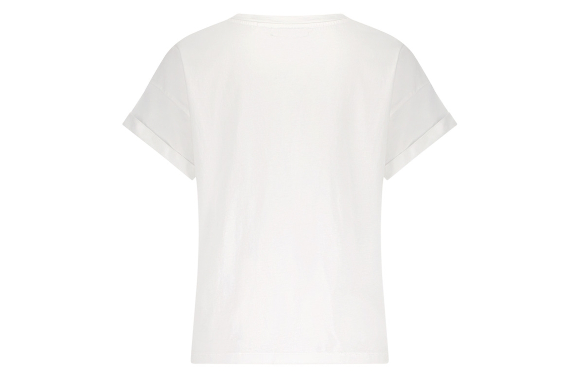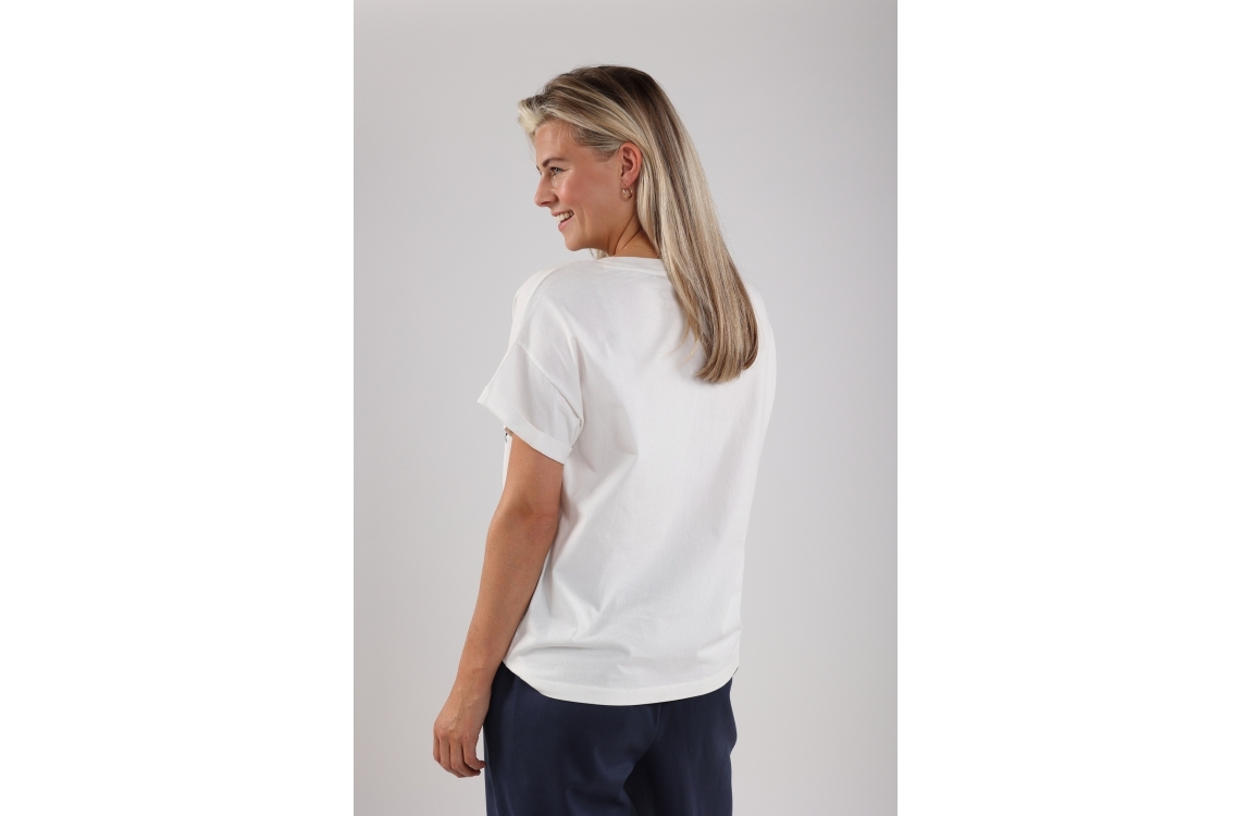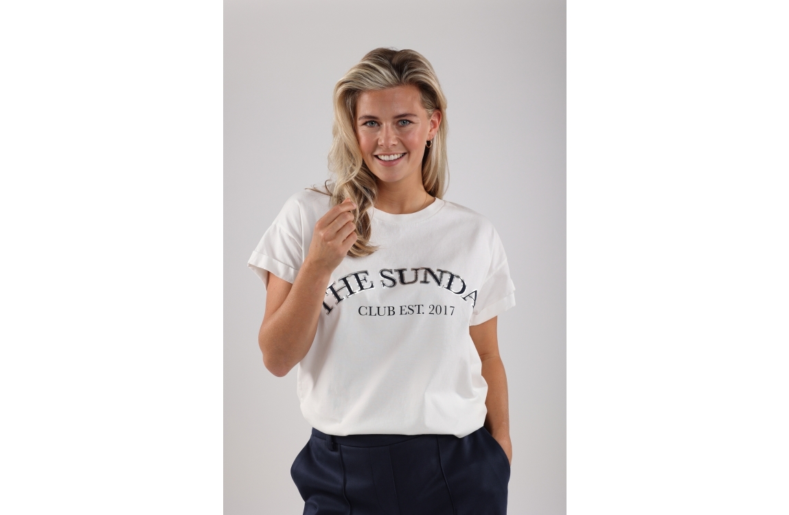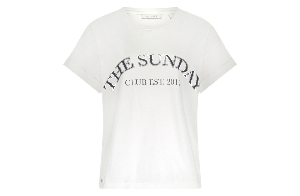 NUKUS T-shirt Meike the Sunday NKS04004. Dit rechtvallend model heeft een ronde hals en korte mouwen met omgeslagen boorden. Deze off white T-shirt van NUKUS is op het voorpand bewerkt met een donkerblauwe tekstopdruk en is uitgevoerd in een comfortabele pasvorm.