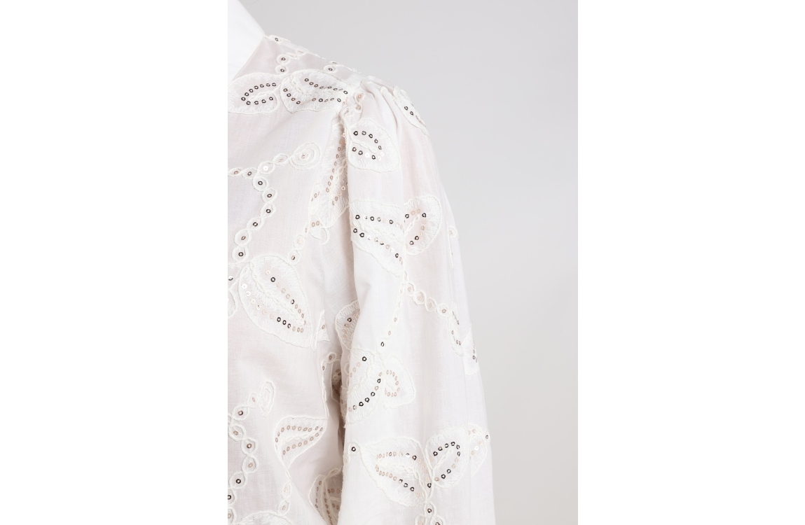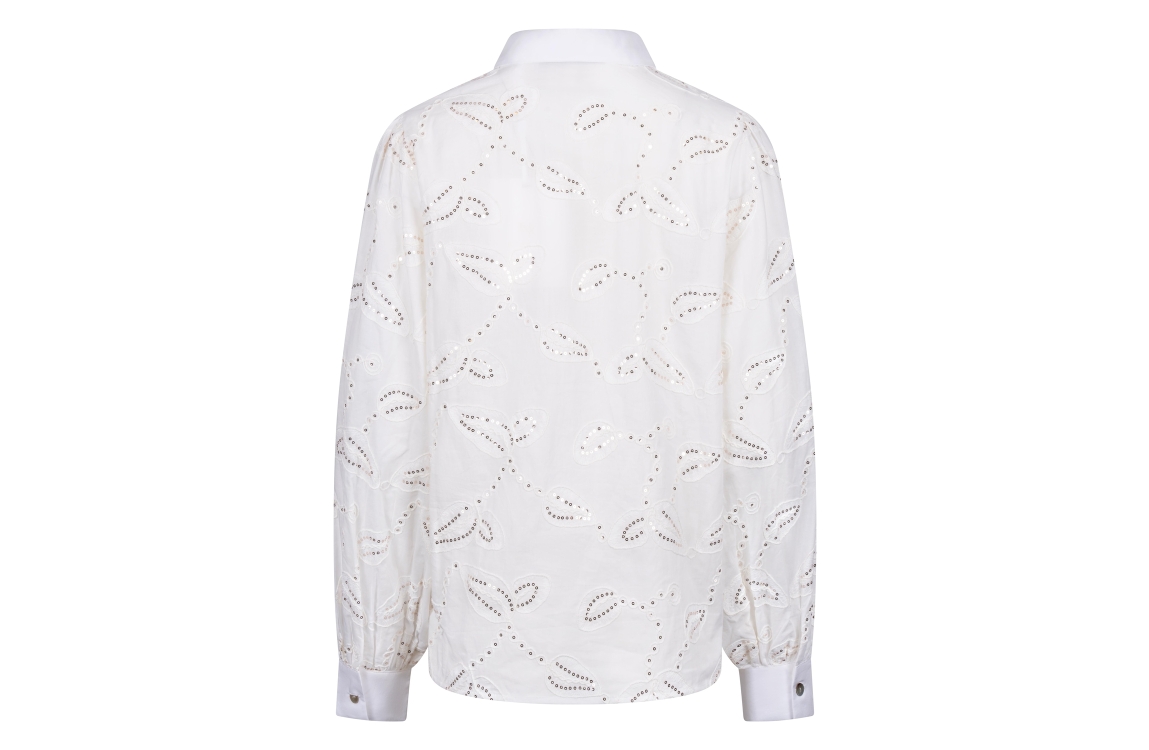 NUKUS Milanova Blouse 17 off white. Dit rechtvallende model is voorzien van een kraag en heeft lange mouwen. Deze off-white blouse van Nukus sluit door middel van knopen en is all-over bewerkt met subtiele pailletten.