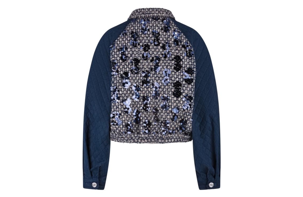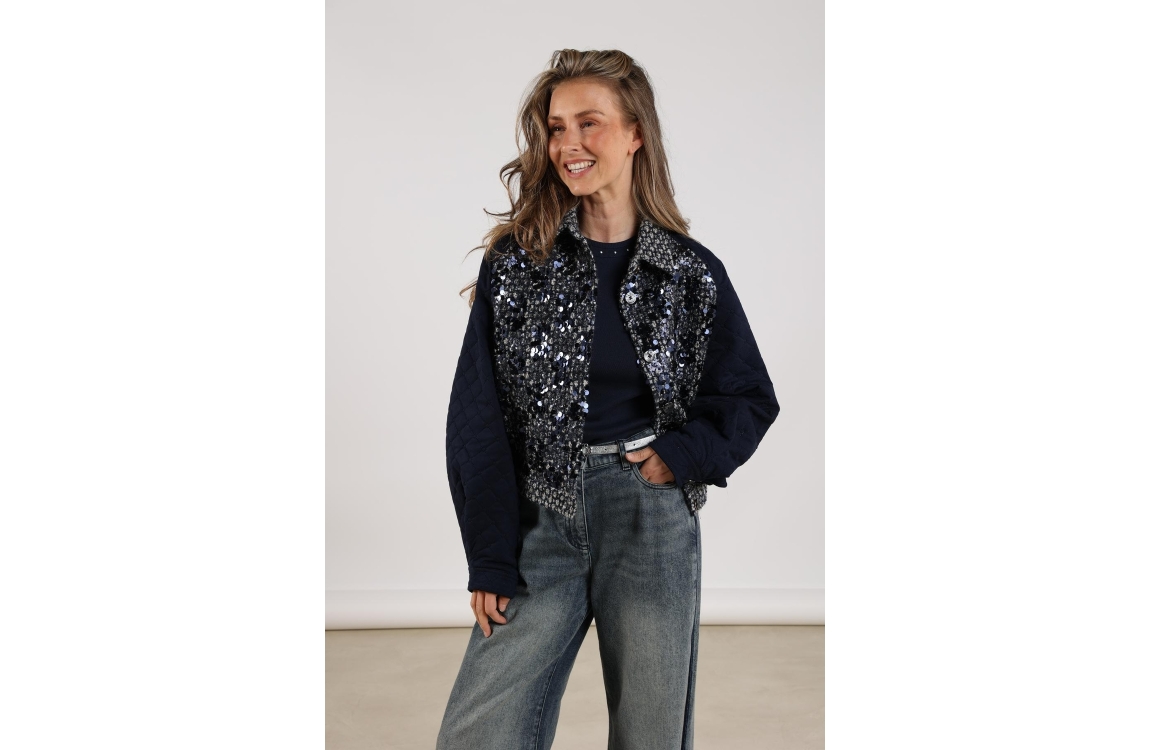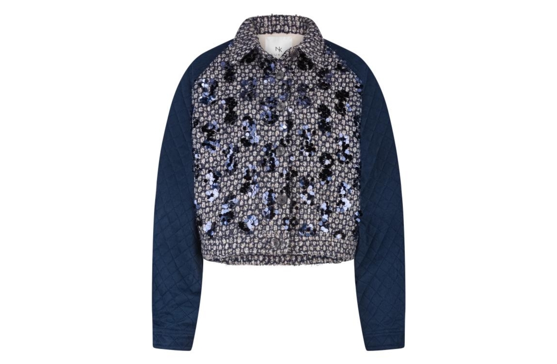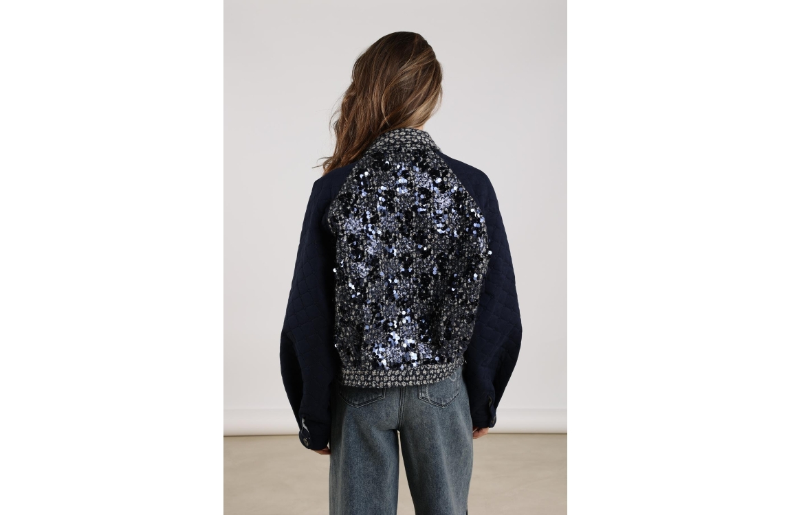 NUKUS jasje NKF13025. Dit rechtvallend model heeft een kraag en lange gewatteerde mouwen. Deze donkerblauwe jas van NUKUS sluit aan de voorzijde door middel van knopen en is bewerkt met tweed-stof en pailletten.