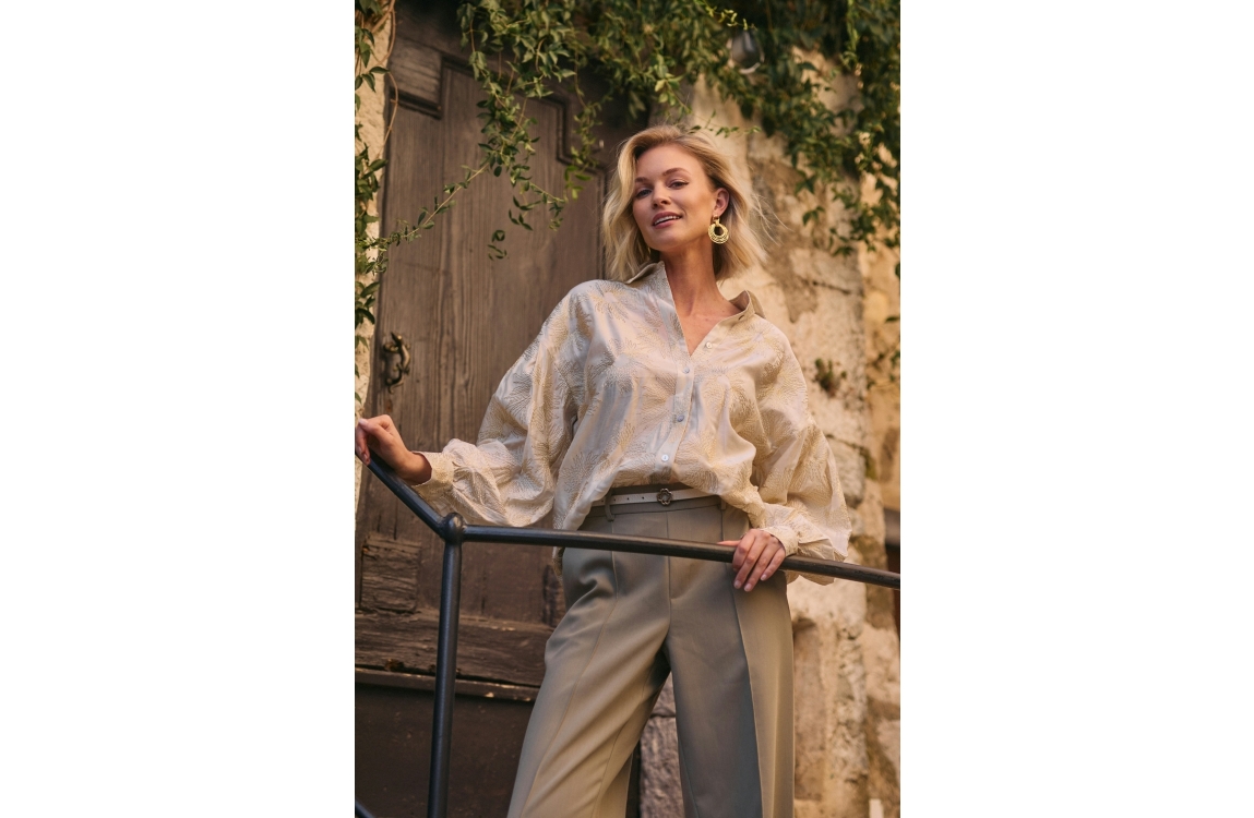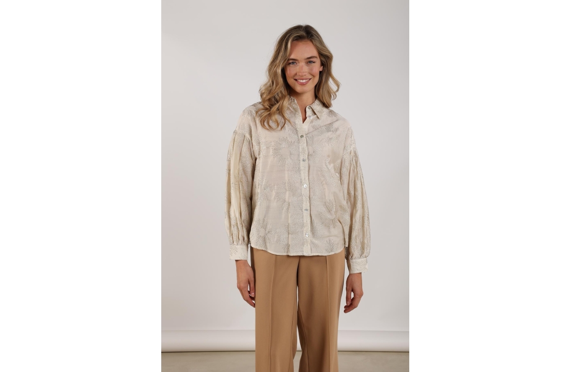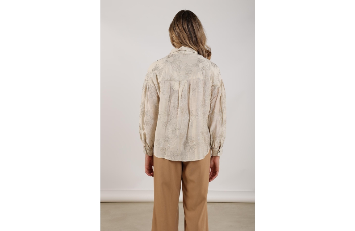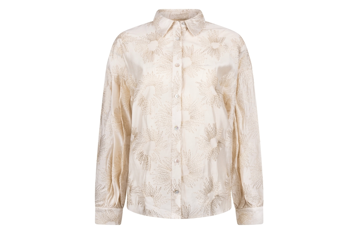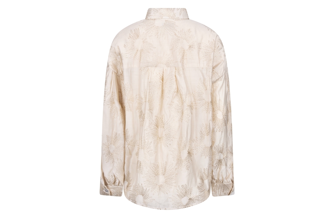 NUKUS Nola Blouse Embroidery 126 offwhite/gold. Dit rechtvallende model heeft een kraag en lange mouwen. Deze gebroken witte blouse van NUKUS sluit door middel van knopen en is bewerkt met een goudkleurige borduursel.