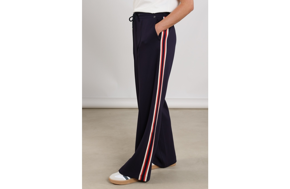 NUKUS Nora Pants 70 navy. Dit rechtvallende model sluit door middel van een elastische tailleband met trekkoord. Deze donkerblauwe broek van NUKUS beschikt over twee steekzakken aan de voorzijde. Dit model is aan de zijkant bewerkt met een tape in de kleuren rood, beige en donkerblauw.