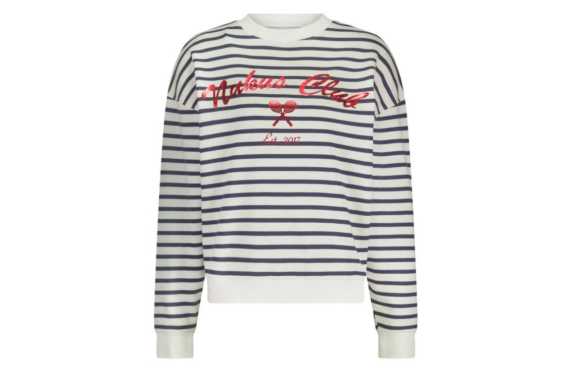 NUKUS Paige Sweater Stripe 137 white/blue. Dit rechtvallende model heeft een ronde hals en lange mouwen. Deze wit/blauw gestreepte sweater van Nukus is op het voorpand bewerkt met een opdruk en is afgewerkt met boorden.