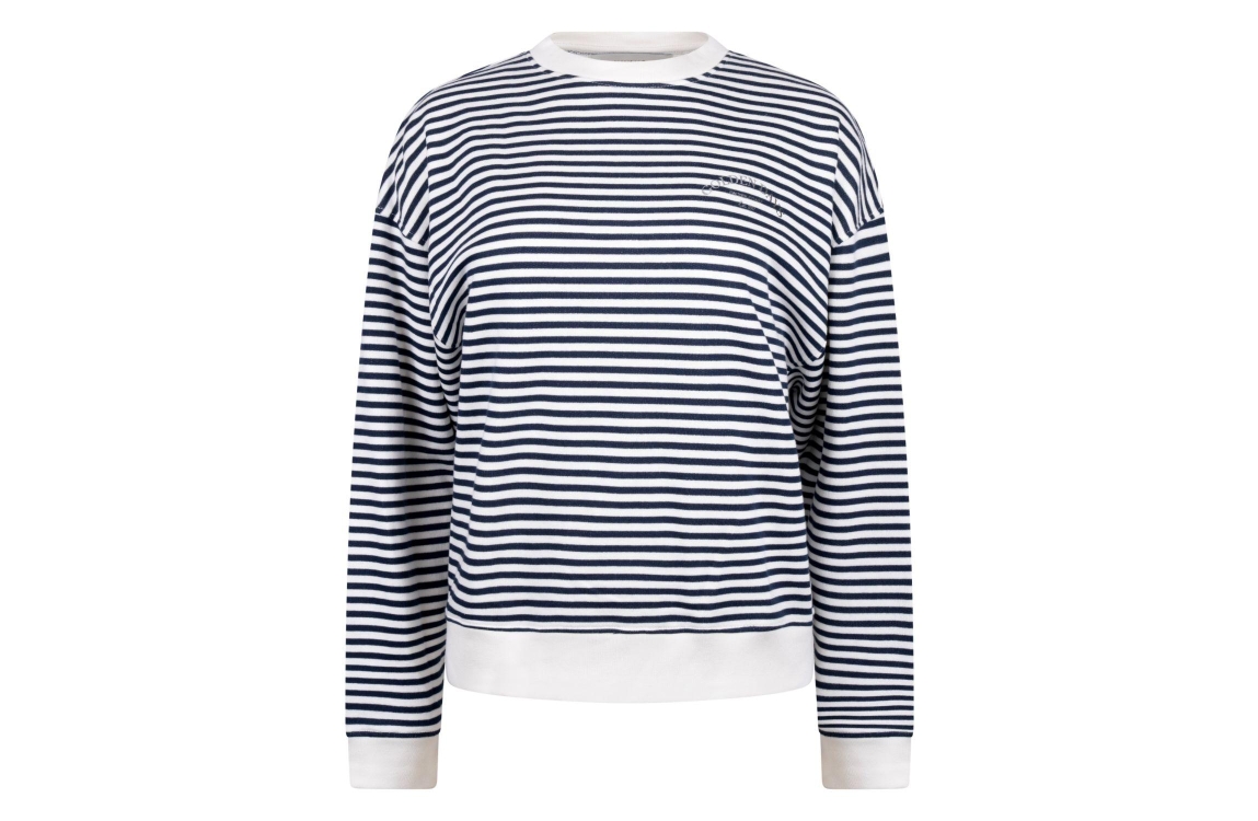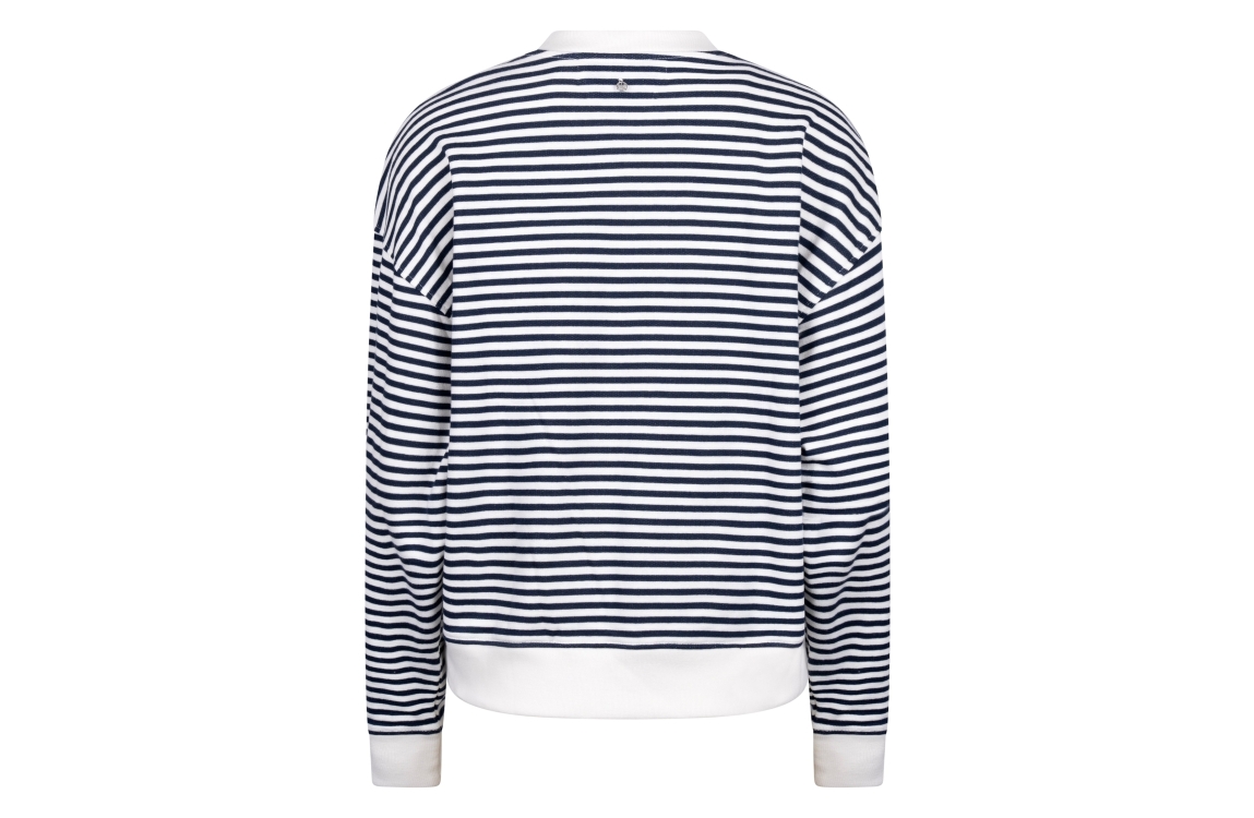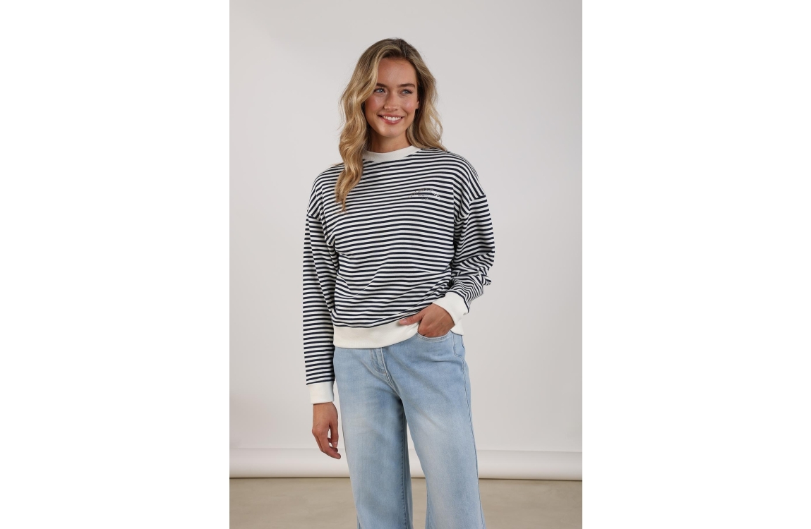 NUKUS Patty Pullover Stripe 219 offwhite/navy. Dit rechtvallende model heeft een ronde hals en lange mouwen. Deze witte sweater van Nukus is all-over bewerkt met een donker blauw strepen patroon.