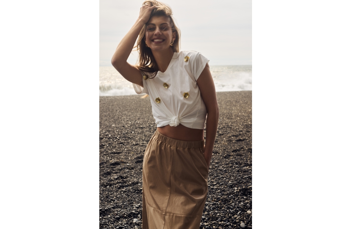 NUKUS Pearly Shirt Flower 17 off white. Dit rechtvallend model is voorzien van een ronde hals en heeft korte mouwen. Deze witte top van NUKUS is aan de voorzijde afgewerkt met gouden bloemen.