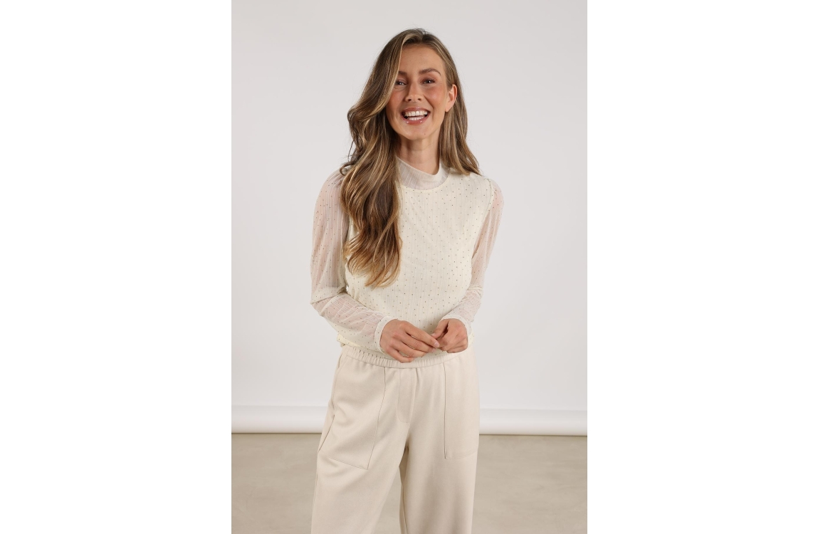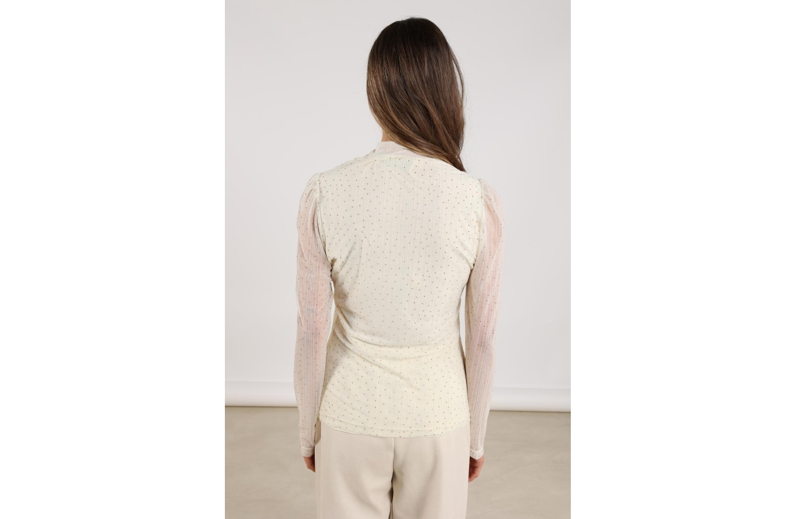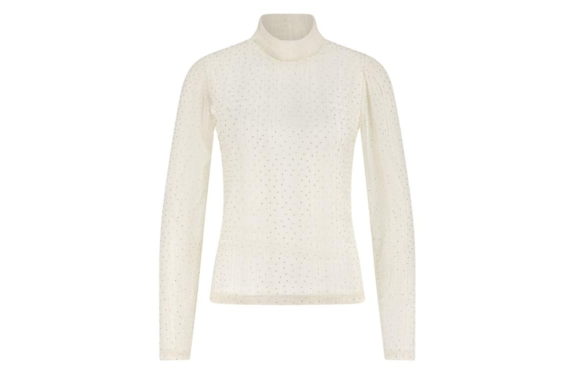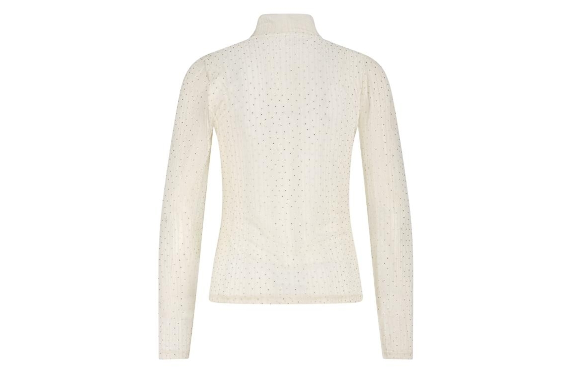 Nukus top Puck Strass NKF01001. Dit aangesloten model is voorzien van een turtle neck en heeft lange mouwen. Deze gebroken witte top is gedeeltelijk uitgevoerd in een meshkwaliteit en is afgewerkt met strass steentjes.