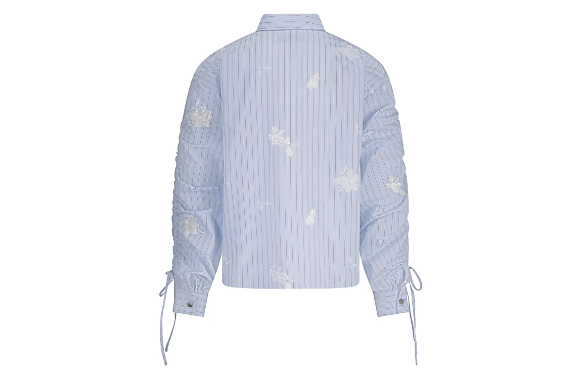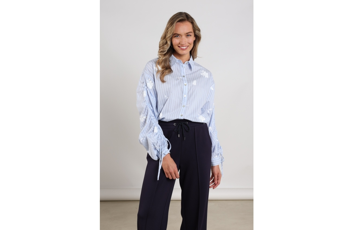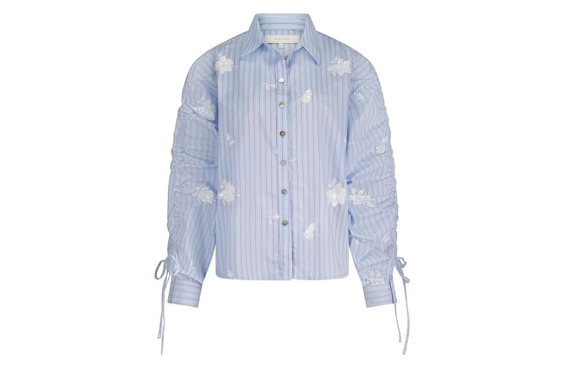 NUKUS Rosa Blouse Stripe 371 sky/kiss. Dit rechtvallende model heeft een kraag en lange mouwen. Deze lichtblauwe blouse van NUKUS sluit door middel van knopen en is bewerkt met een strikdetail op de mouw. Dit model is all-over bewerkt met geborduurde bloemen.