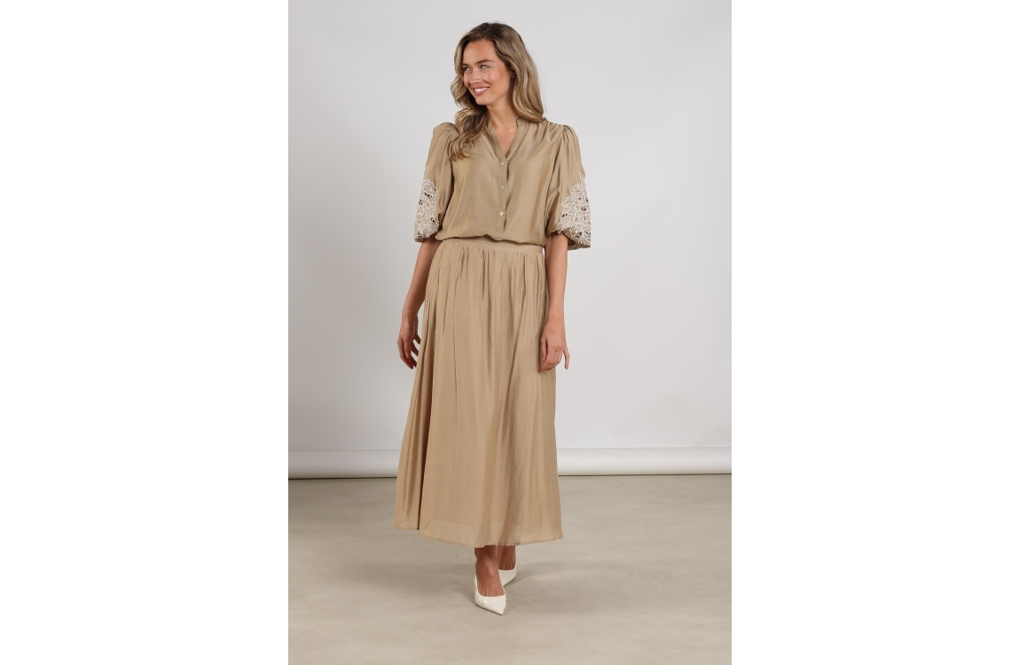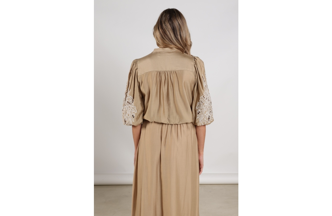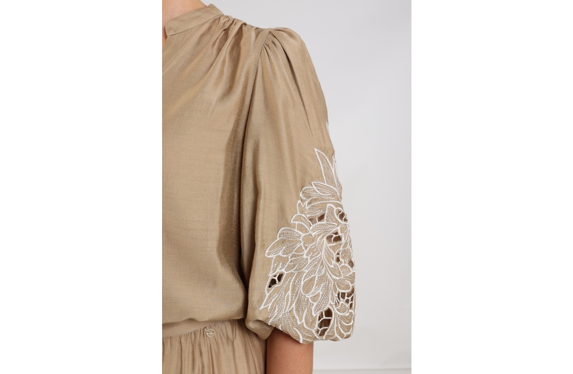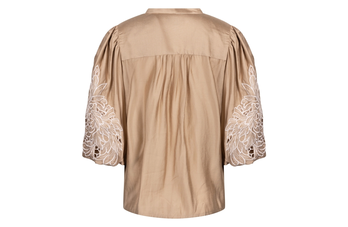 NUKUS Rosie Blouse Embrodery 64 camel. Dit wijdvallende model is voorzien van een V-hals en heeft korte mouwen. Deze bruine blouse van Nukus sluit door middel van knopen aan de voorzijde. Dit model is op de mouwen bewerkt met opengewerkte embroidery.