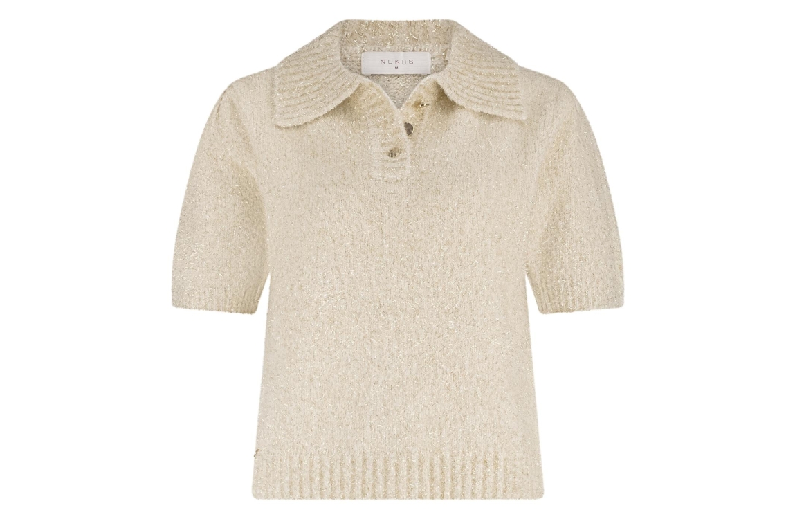 NUKUS Sandra Pullover 9 sand. Dit rechtvallende model heeft een kraag met knopen en korte mouwen. Deze beige pullover van Nukus is bewerkt met lurex draden. Dit model is afgewerkt met ribboorden.