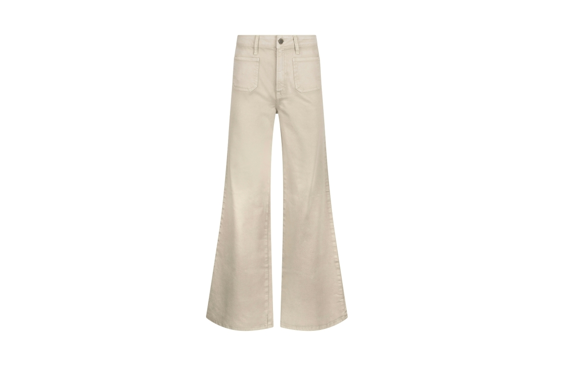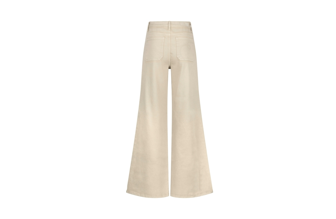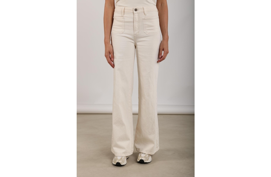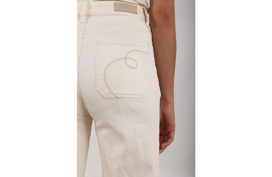 NUKUS Scarlet Pants 17 off white. Dit rechtvallende model sluit door middel van een knoop en rits afgewerkt met ceintuurlussen. Deze beige jeans van Nukus is uitgevoerd met een opvallend detail: een glitterdesign op de achterzak voor een subtiele sparkle. Dit model heeft twee kleine zakjes op de voorkant.