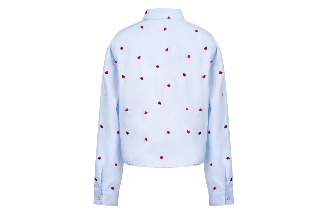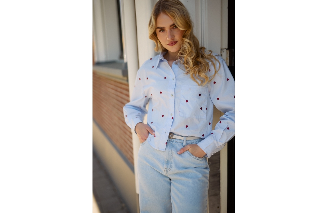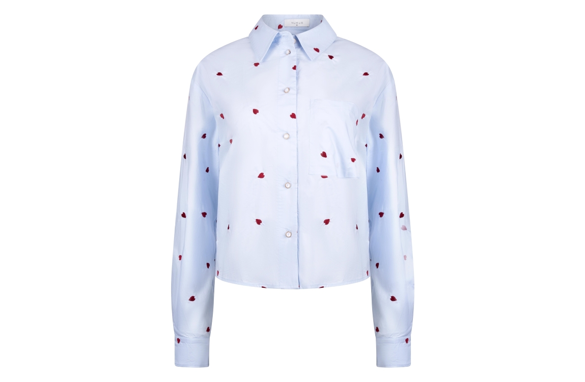NUKUS Sorrento Blouse Heart 371 sky/kiss. Dit rechtvallende model heeft een kraag en lange mouwen. Deze lichtblauwe blouse van NUKUS sluit door middel van knopen en is all-over bewerkt met een rode hartjesprint.