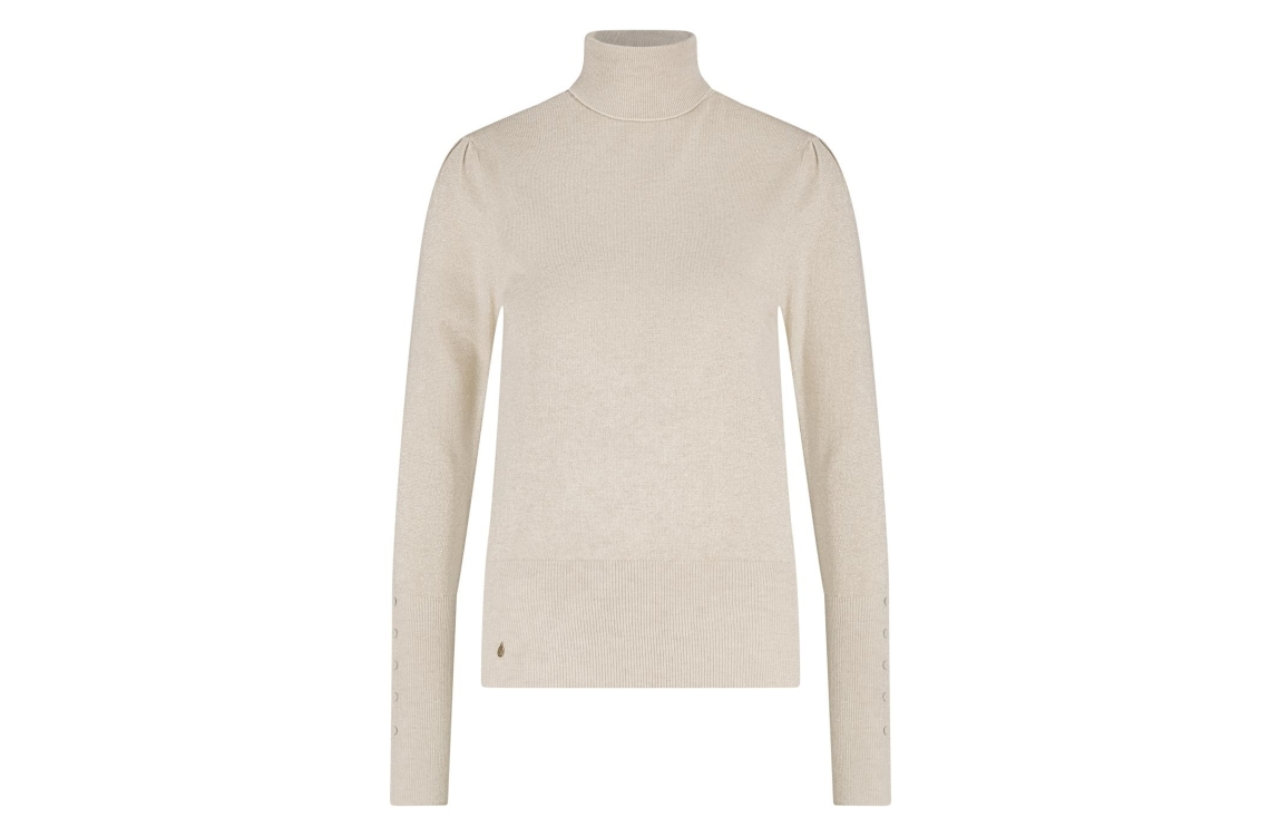 NUKUS Sylvia Pullover Lurex 9 sand. Dit rechtvallende model heeft een col en lange mouwen. Deze beige pullover van NUKUS is all-over bewerkt met glitterdraden en heeft gebreide en aansluitende mouwboorden. Dit model is aan de uiteinde van de mouwen bewerkt met knoopjes.
