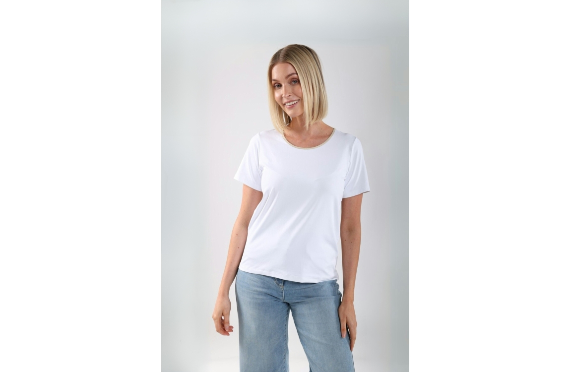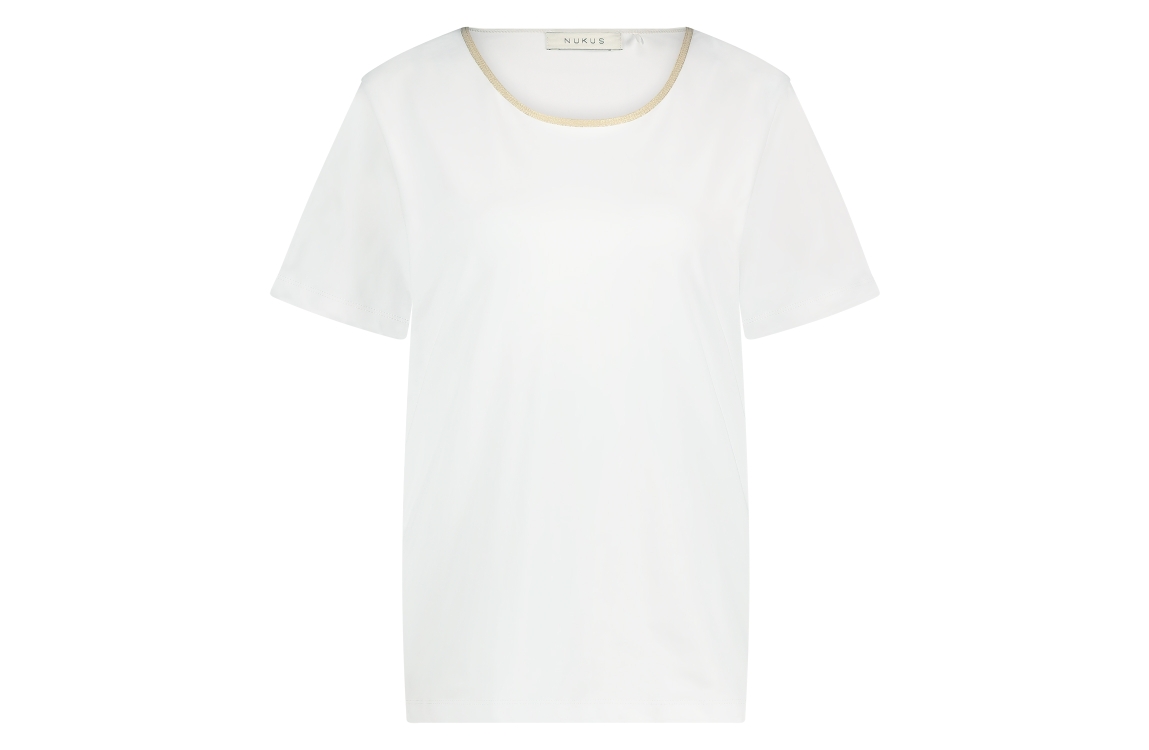 NUKUS Tirza Top Uni 16 white. Dit rechtvallende model is voorzien van een ronde hals en heeft korte mouwen. Deze witte top van Nukus is bij de hals afgewerkt met een subtiel goud lurex randje.