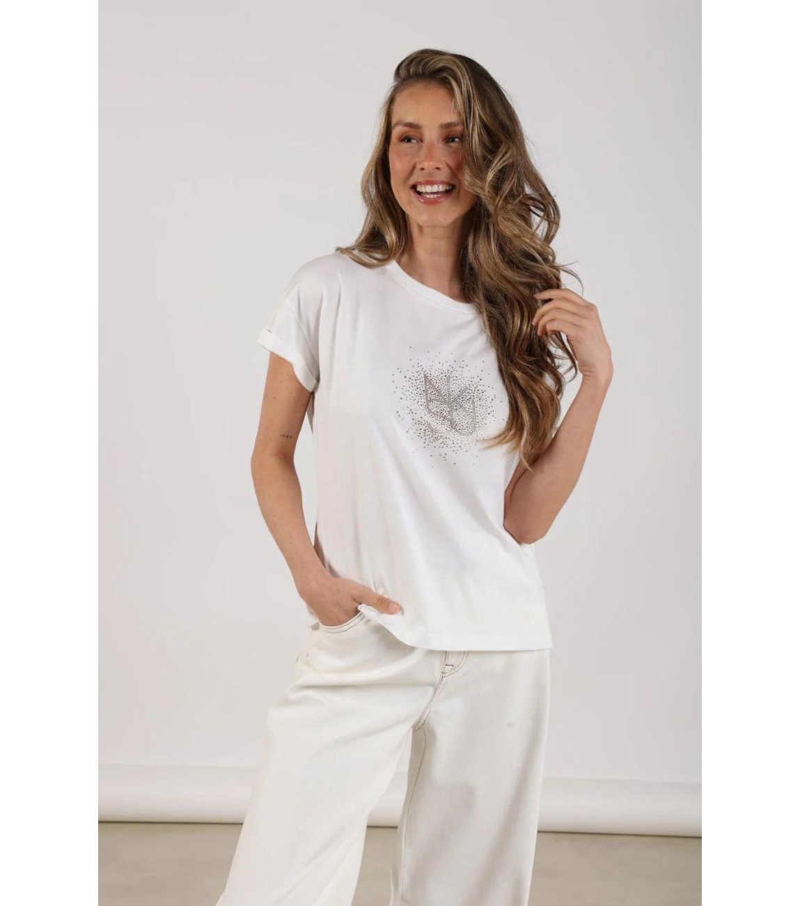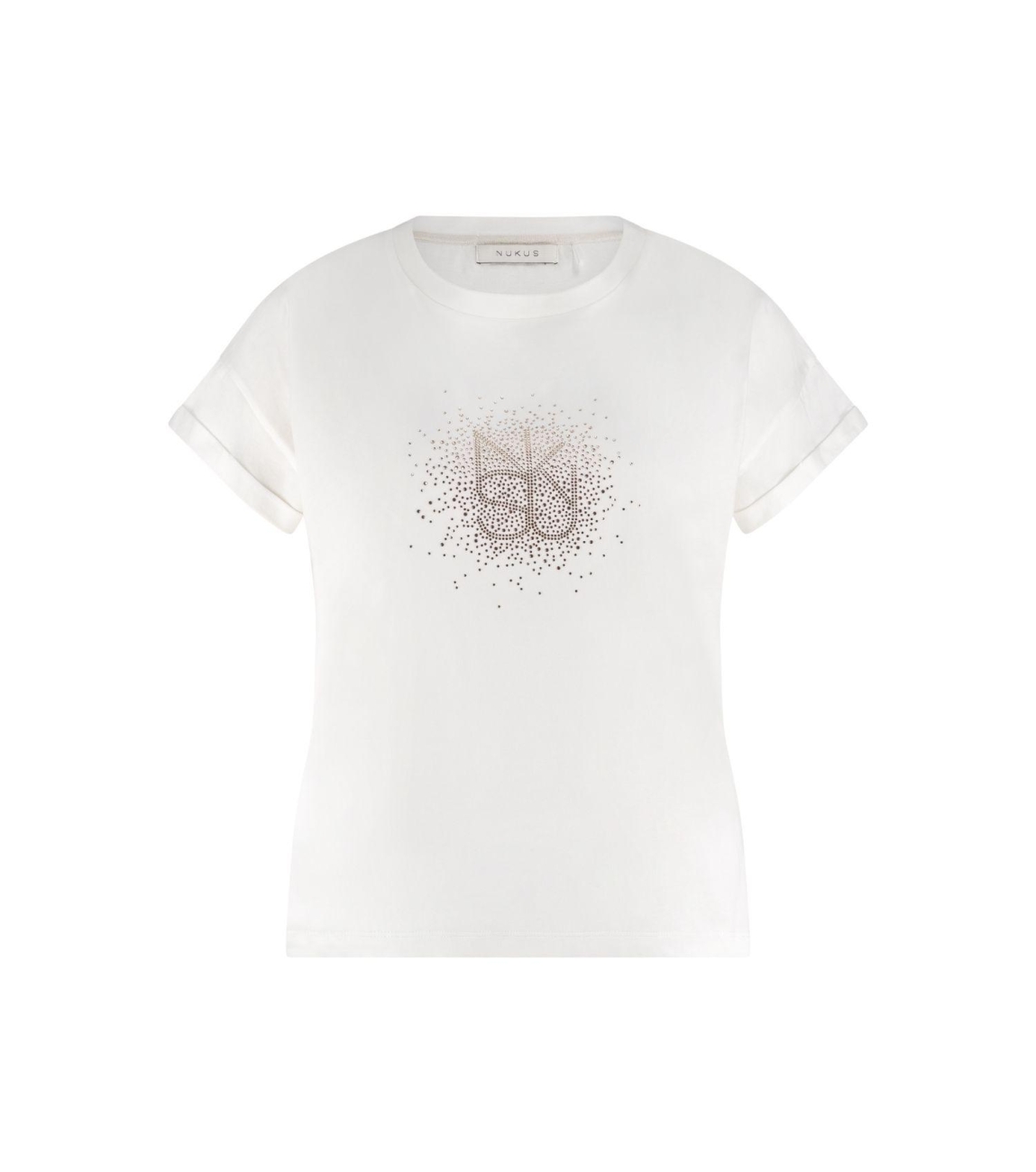 NUKUS Vilamoura Shirt NK Strass 17 off white. Dit rechtvallend model is voorzien van een ronde hals en heeft korte mouwen. Deze off white top van Nukus is aan de voorzijde bewerkt met strass steentjes in de vorm van het Nukus logo.