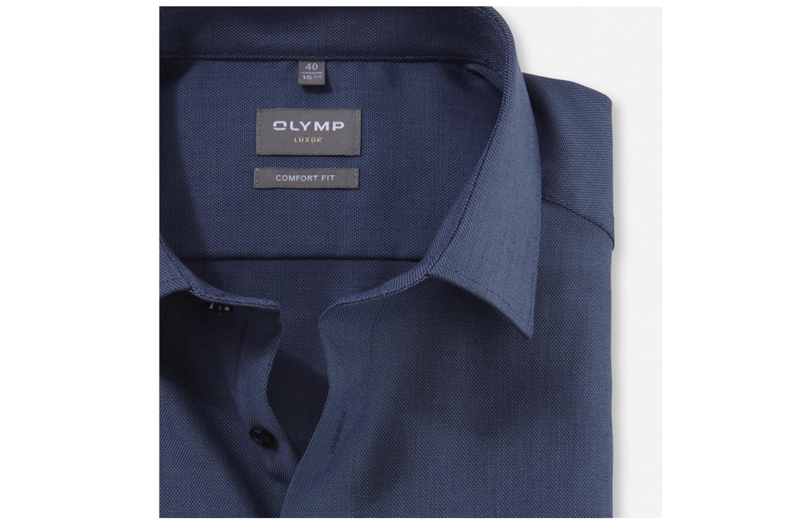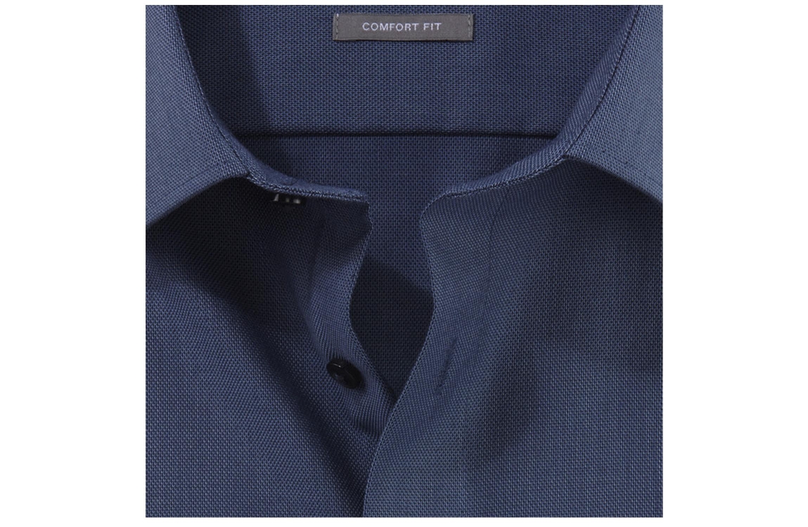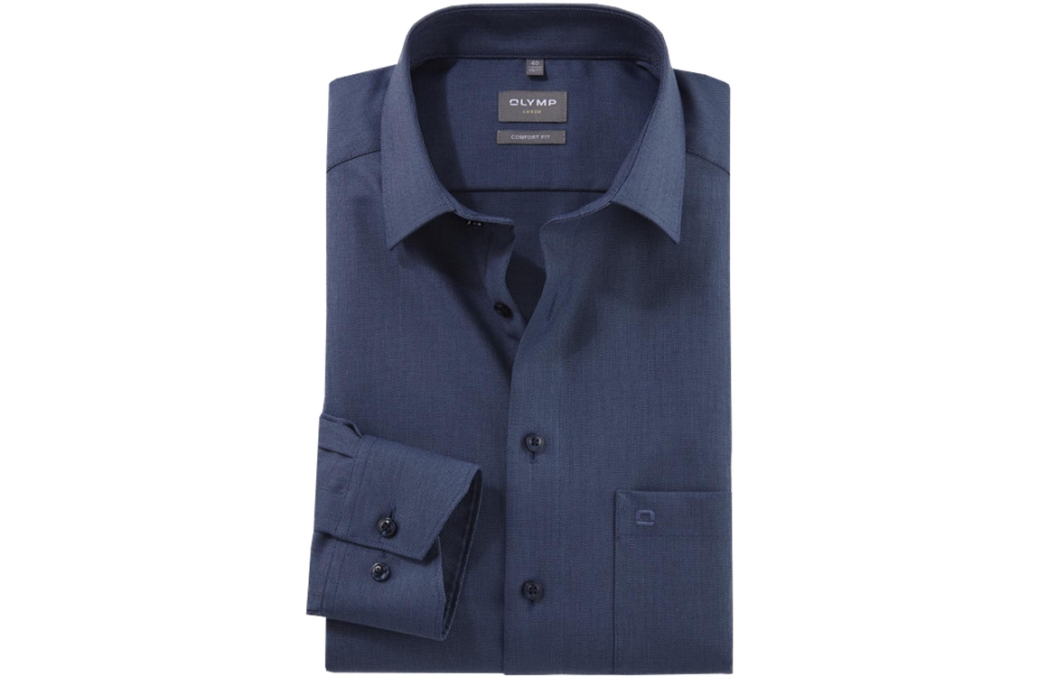 Olymp overhemd 1026|64|13. Dit comfort fit model is uitgevoerd met een new kent kraag en heeft lange mouwen. Dit blauwe overhemd van Olymp sluit door middel van knopen, is bewerkt met een effen weefpatroon en is afgewerkt met een borstzak.