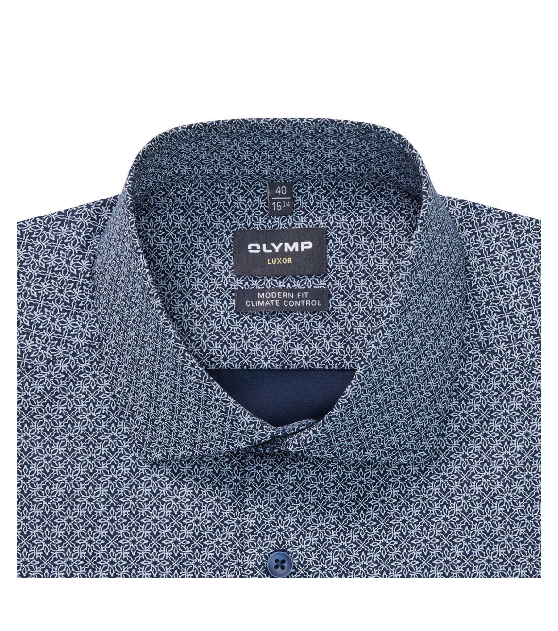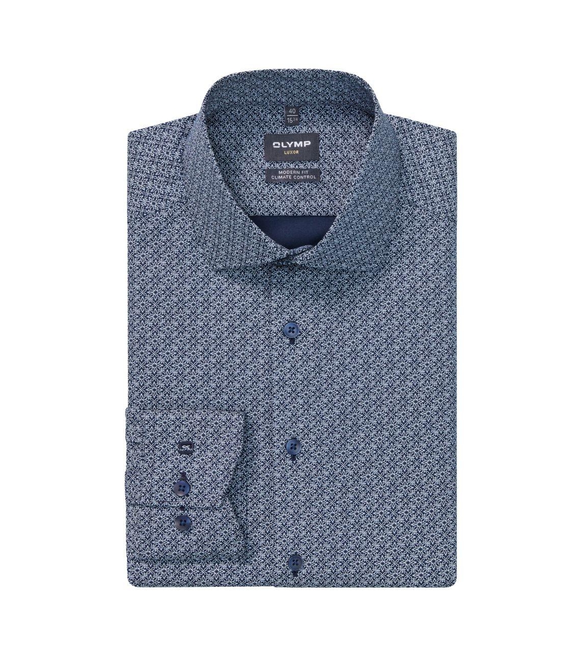 Olymp Luxor overhemd 130884 18. Dit modern fit model sluit door middel van knopen en heeft een new-kent kraag en lange mouwen. Deze donkerblauwe overhemd van Olymp heeft een all-over print met een nauwsluitende pasvorm, bewegingsvrijheid en heeft ademende eigenschappen.