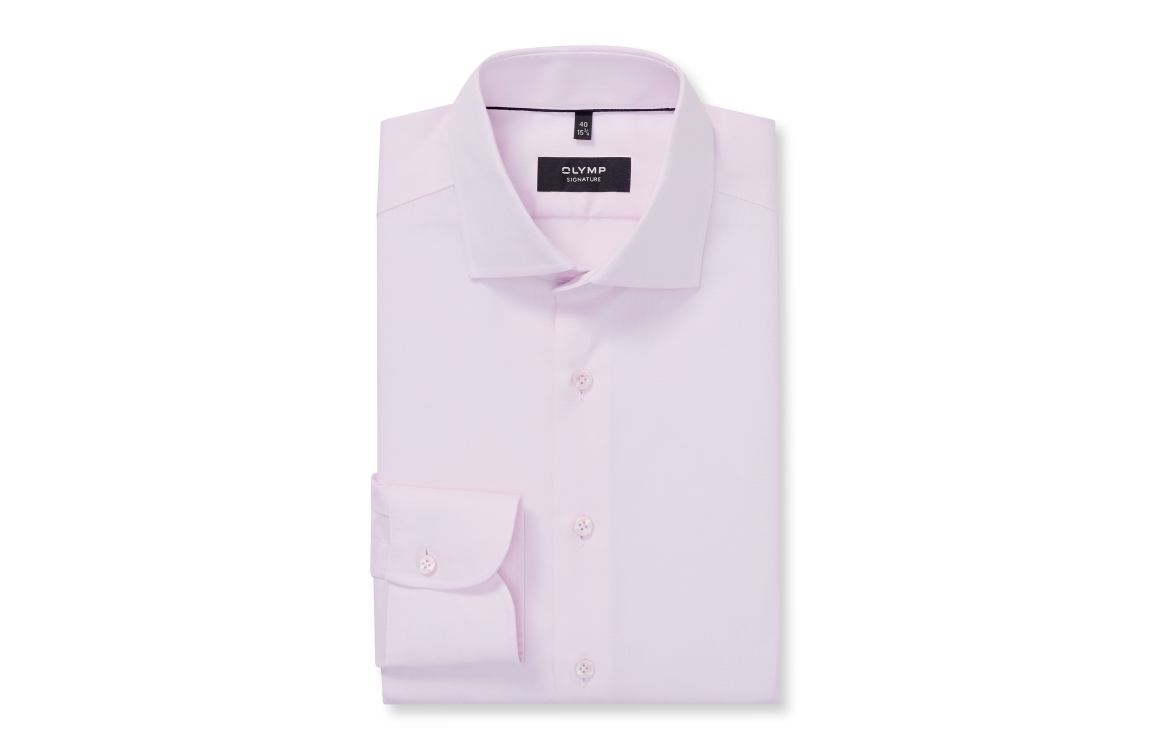 Overhemd Olymp Signature 850914 30. Dit tailored fit model heeft een kraag en lange mouwen. Deze roze overhemd van Olymp sluit door middel van knopen en is uitgevoerd in een effen-kwaliteit.