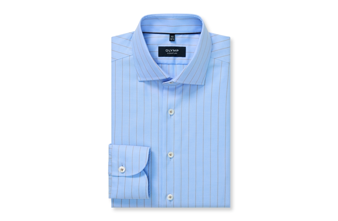 Overhemd Olymp Signature 851214 11. Dit tailored fit model heeft een kraag en lange mouwen. Deze lichtblauwe overhemd van Olymp sluit door middel van knopen en is all-over bewerkt met een bruinkleurige streepprint.