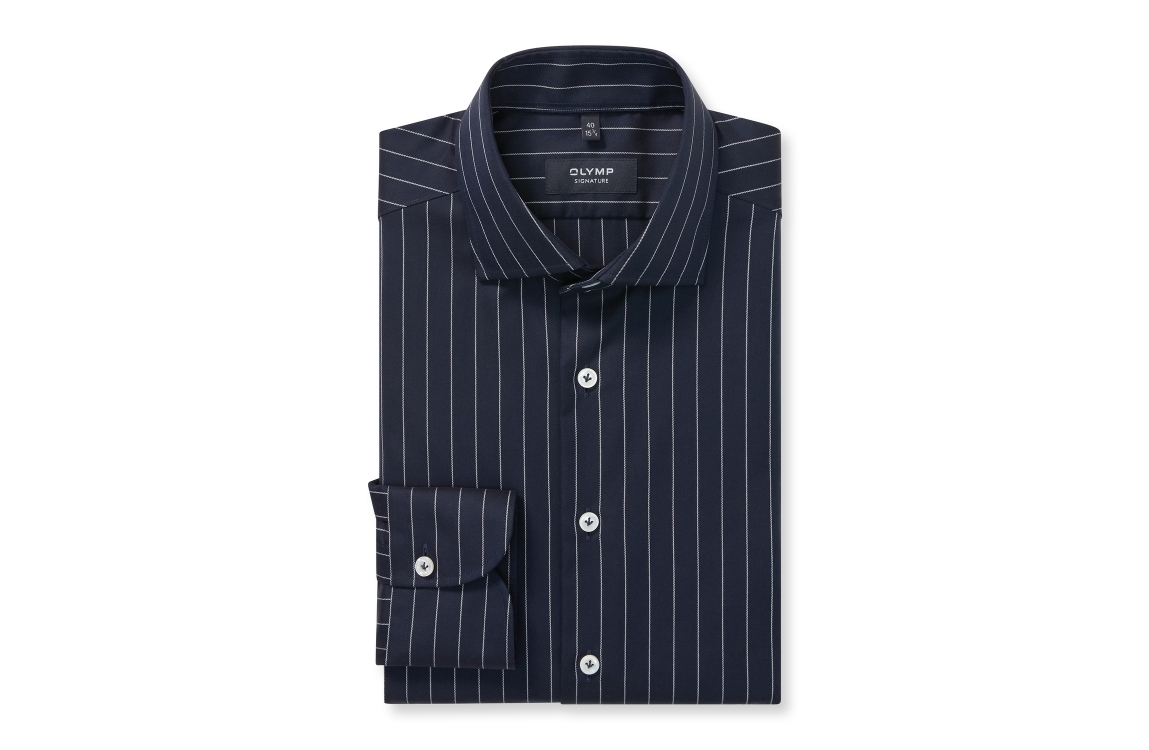 Overhemd Olymp Signature 851214. Dit tailored fit model heeft een kraag en lange mouwen. Deze donkerblauwe overhemd van Olymp sluit door middel van knopen en is all-over bewerkt met een streepprint.