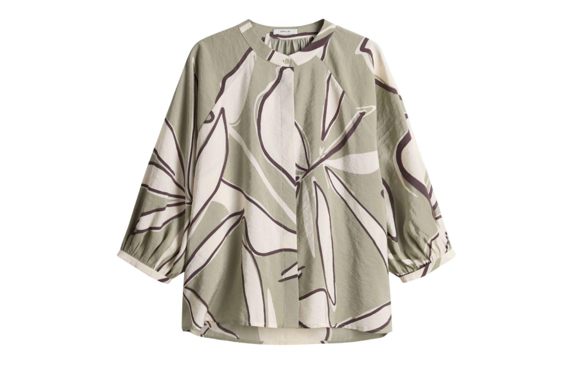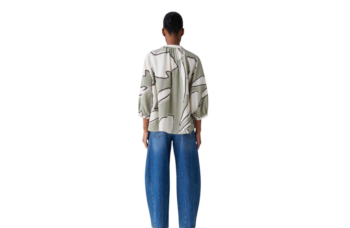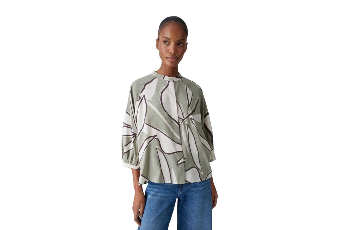 Opus blouse Faloom 10531713968418. Dit wijdvallende model heeft een ronde halslijn en driekwart mouwen. Deze olijfkleurige blouse van Opus sluit aan de voorzijde door middel van (blinde) knopen en is all-over bewerkt met een grafische print Het model is gedetailleerd met een vloeiende drapering en is uitgevoerd in geweven stof.