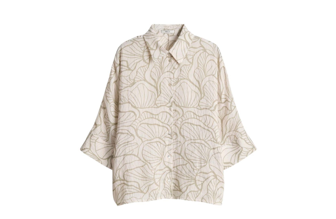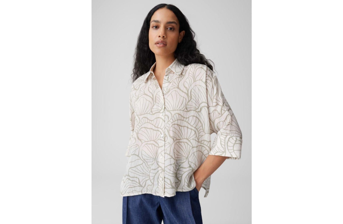 Opus blouse Fashell 10550314082423. Dit rechtvallend model is voorzien van een kraag en heeft driekwart mouwen. Deze witte blouse van Opuys sluit door middel van knopen en is all-over bewerkt met een groene bloemenprint.
