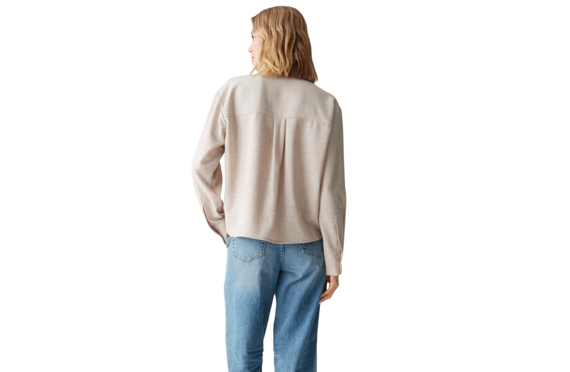 Opus blouse 10472713551100 2088. Dit rechtvallende model heeft een kraag en lange mouwen met afgewerkte manchetten. Deze zandkleurige blouse van Opus sluit door middel van knopen en is voorzien van twee borstzakken.