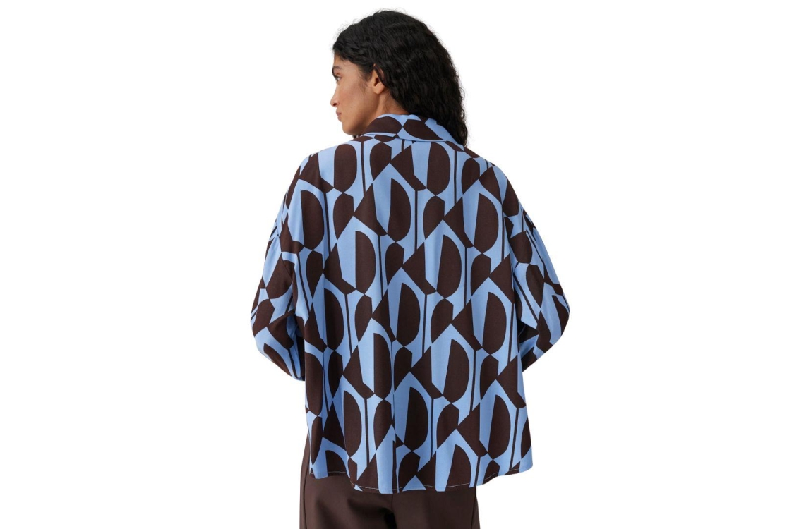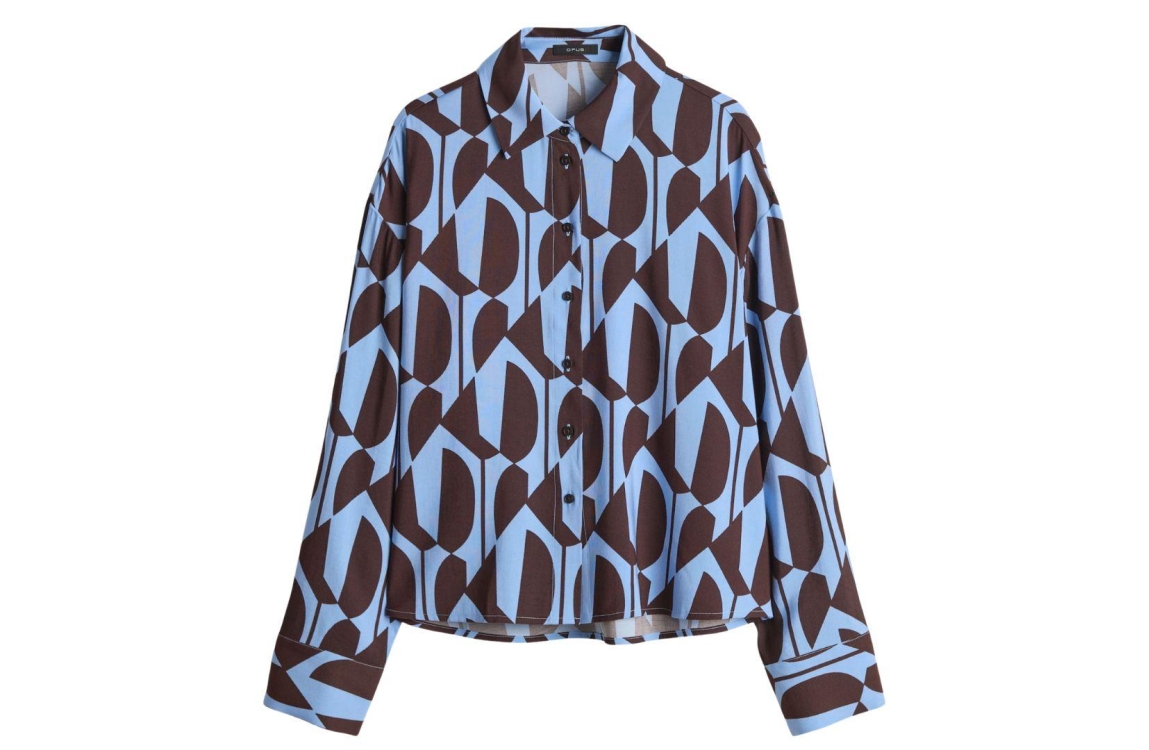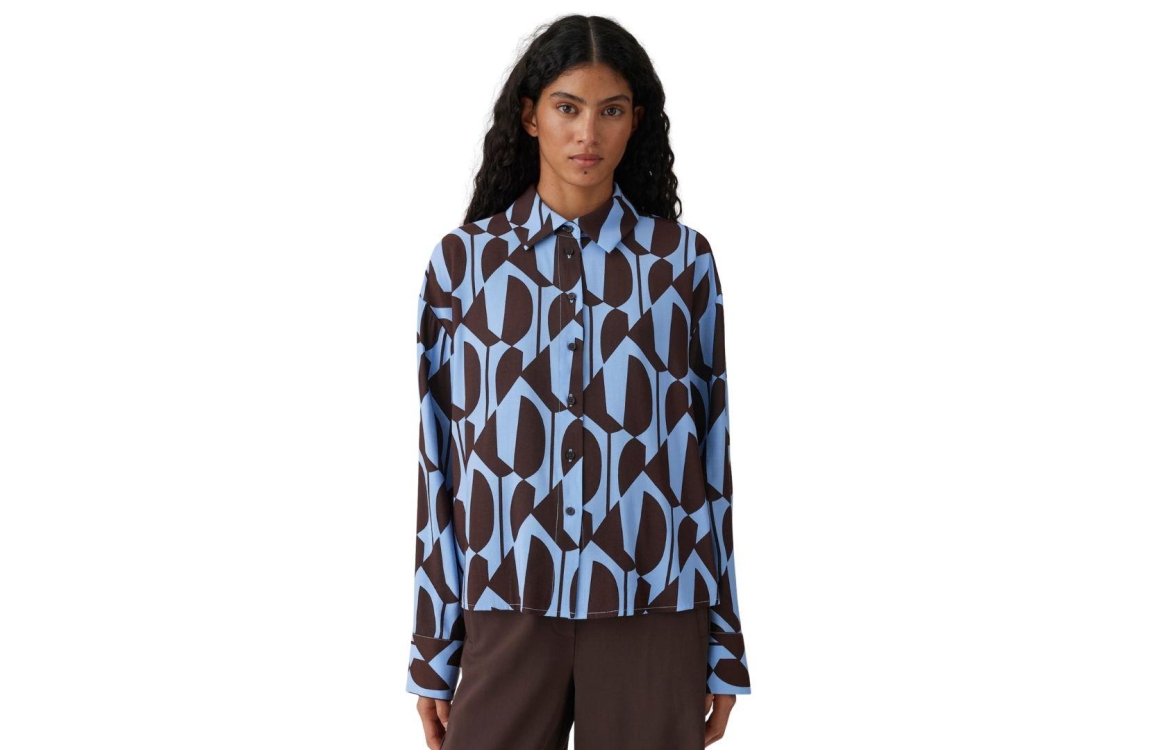 Opus blouse Fetro 10516413863412. Dit wijdvallende model heeft een kraag met gedropte schouders en lange mouwen. Deze blauwe blouse van Opus sluit aan de voorzijde door middel van knopen en is all-over bewerkt met een keperstructuur in de kleur bruin. Het model is uitgevoerd in een geweven stof en heeft een verkorte lengte.