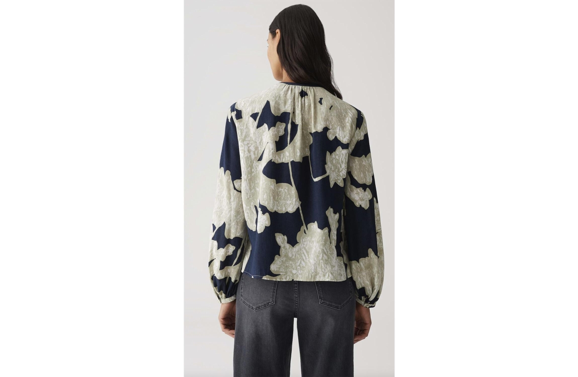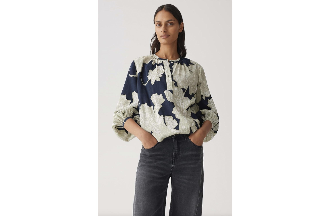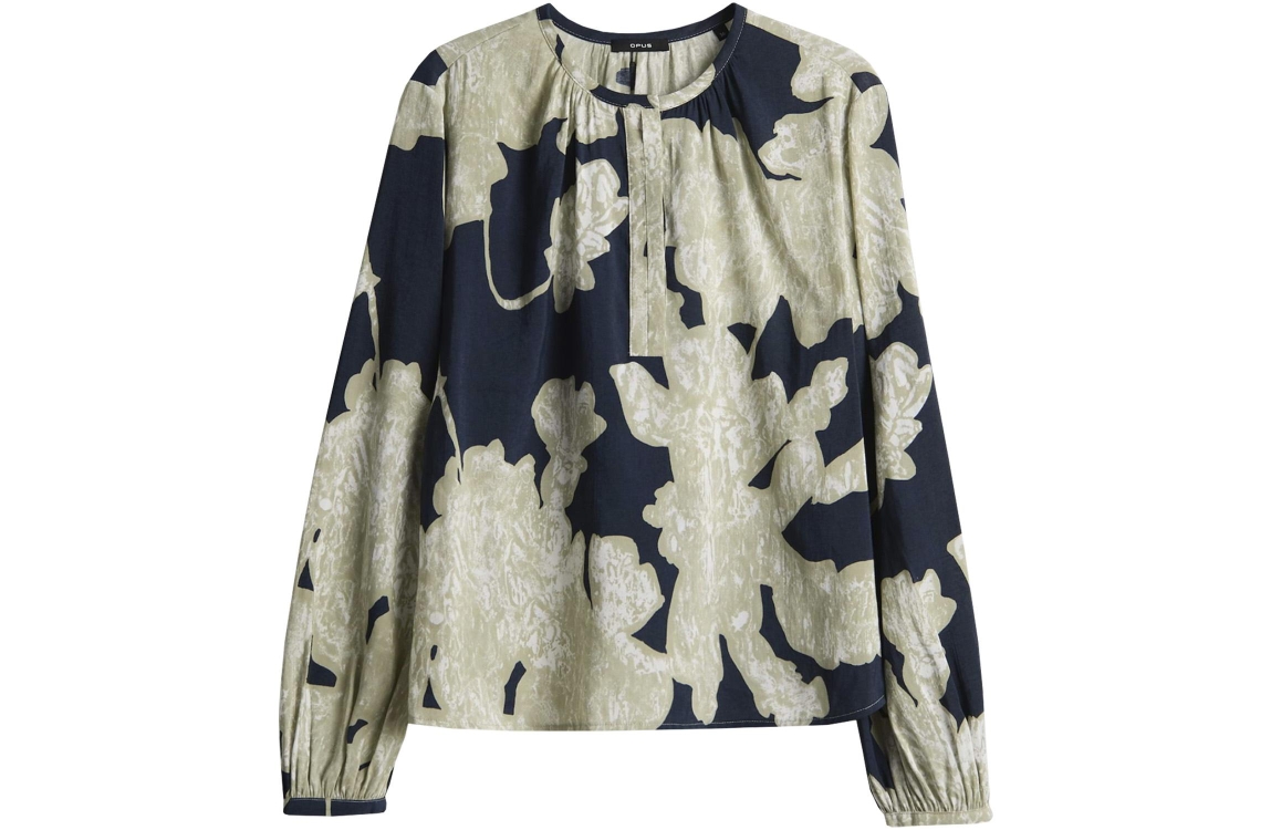 OPUS blouse Ficona Analogue 60020. Dit soepelvallende model is voorzien van een ronde hals en heeft lange mouwen afgewerkt met een elastische boord. Deze groen/donkerblauwe blouse van OPUS sluit aan de voorzijde door middel van knopen. Dit model is bewerkt met een bloemenprint.