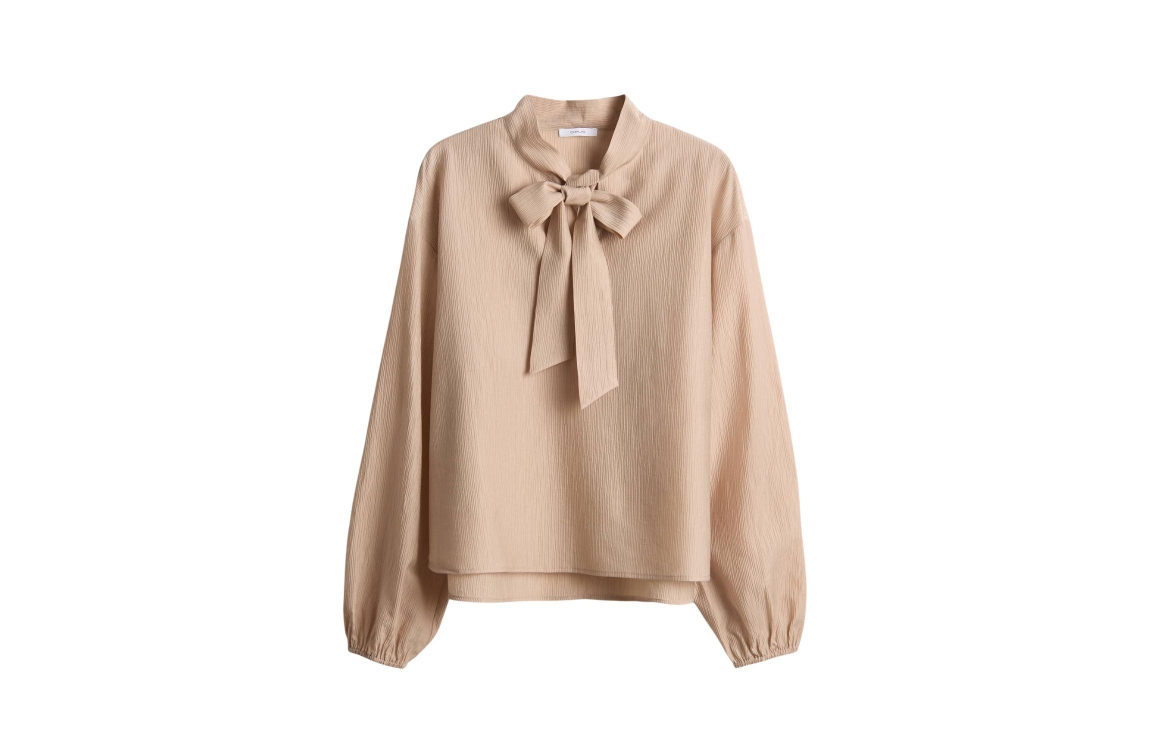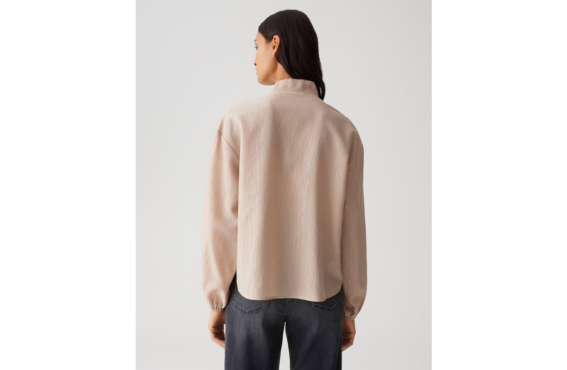 Opus Fomantica 2088 Macadamia. Dit rechtvallende model is voorzien van een v-hals met een strik detail en heeft lange mouwen. Deze beige blouse van Opus is uitgevoerd met een subtiele kreuktextuur. Dit model is langer aan de achterkant dan aan de voorkant.