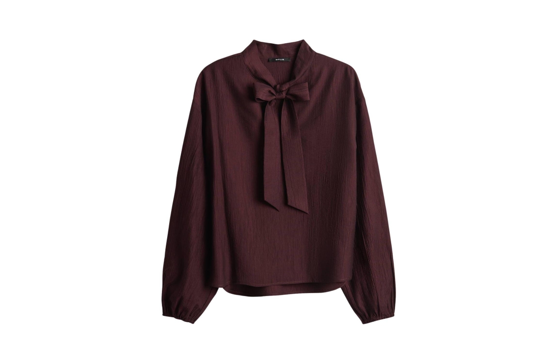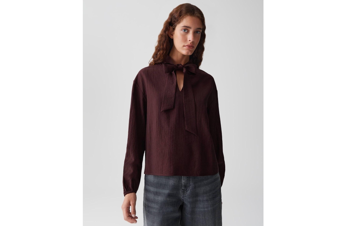 Opus Fomantica 40039 Dark grape. Dit rechtvallende model is voorzien van een v-hals met een strik detail en heeft lange mouwen. Deze burgundy blouse van Opus is uitgevoerd met een subtiele kreuktextuur. Dit model is langer aan de achterkant dan aan de voorkant.