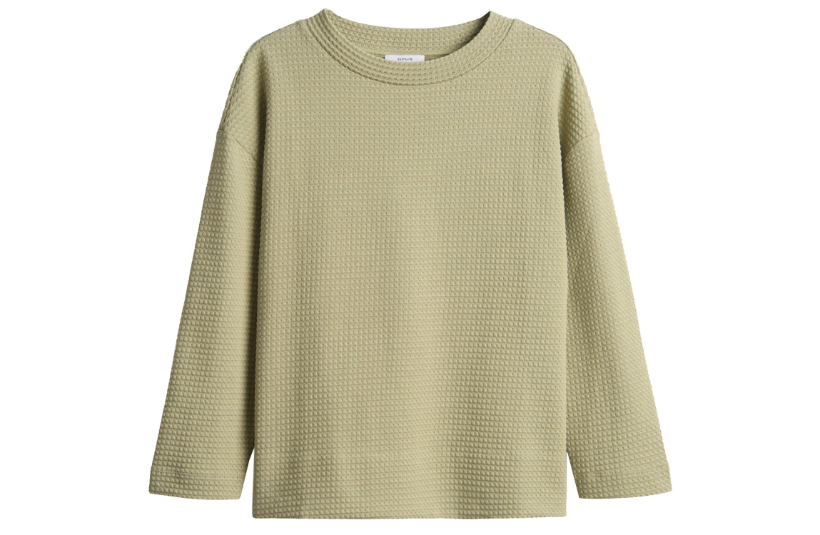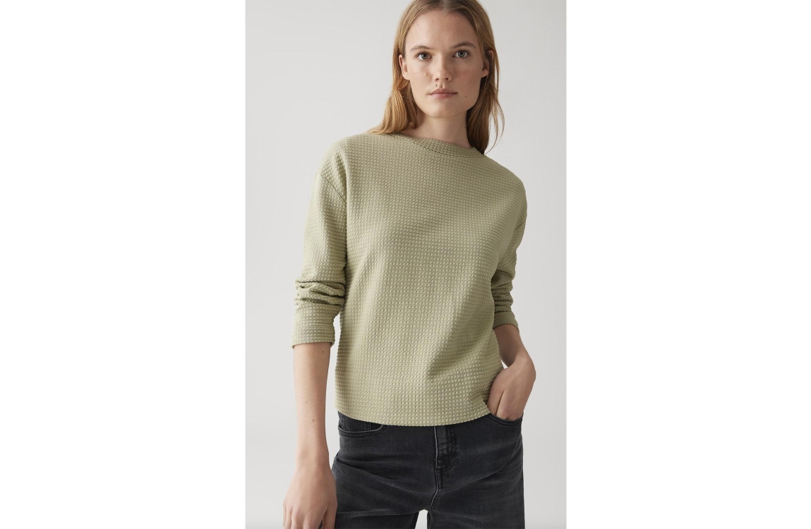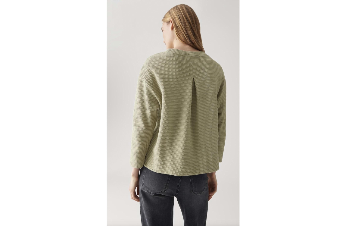 OPUS pullover Gelix 30041. Dit wijdvallende model is voorzien van een ronde hals en heeft 3/4 mouwen. Deze groene pullover van OPUS is aan de achterzijde voorzien van een plooi. Dit model is bewerkt met een all over textuur.