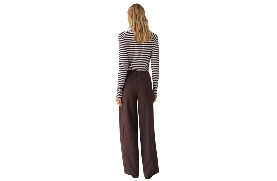 Opus broek Melane Flow 10496814139412. Dit wide fit model sluit door middel van een elastische tailleband met trekkoord en heeft een lange lengte. Deze koffiebruine broek van Opus is voorzien van twee steekzakken aan de voorzijde en twee paspelzakken aan de achterzijde. Het model is uitgevoerd in kreukvrije kwaliteit en geweven stof.