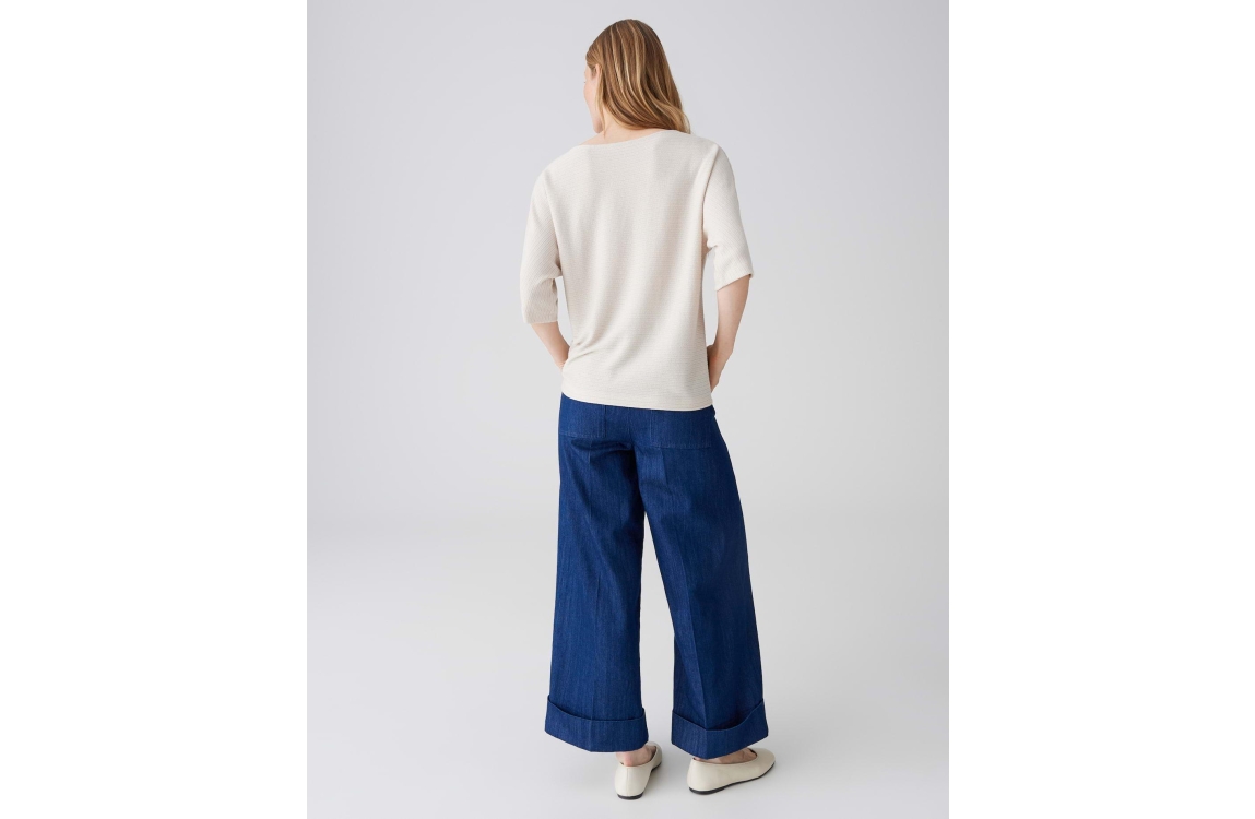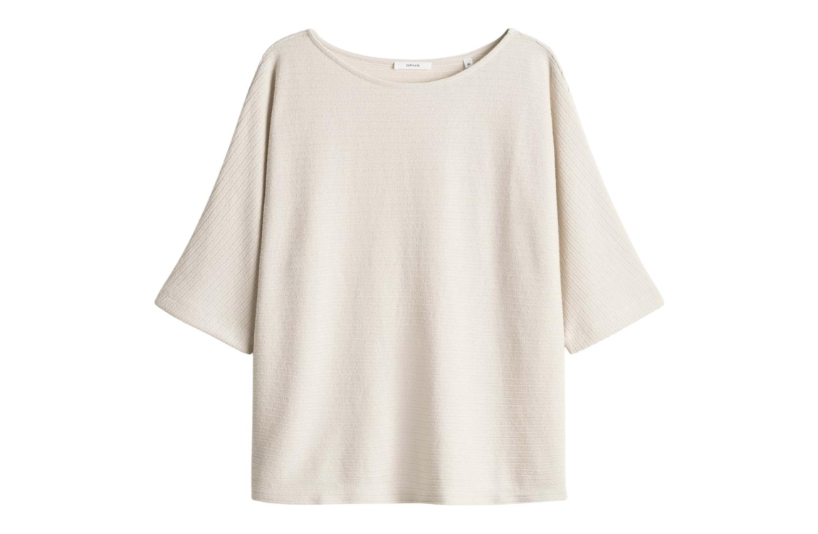 Opus Serifos 10537614004418 top. Dit soepelvallend model heeft een ronde hals en driekwart mouwen. Deze beige top van Opus is bewerkt met horizontale strepen en uitgevoerd in een licht materiaal.