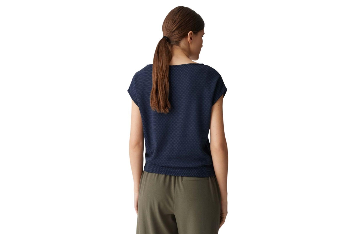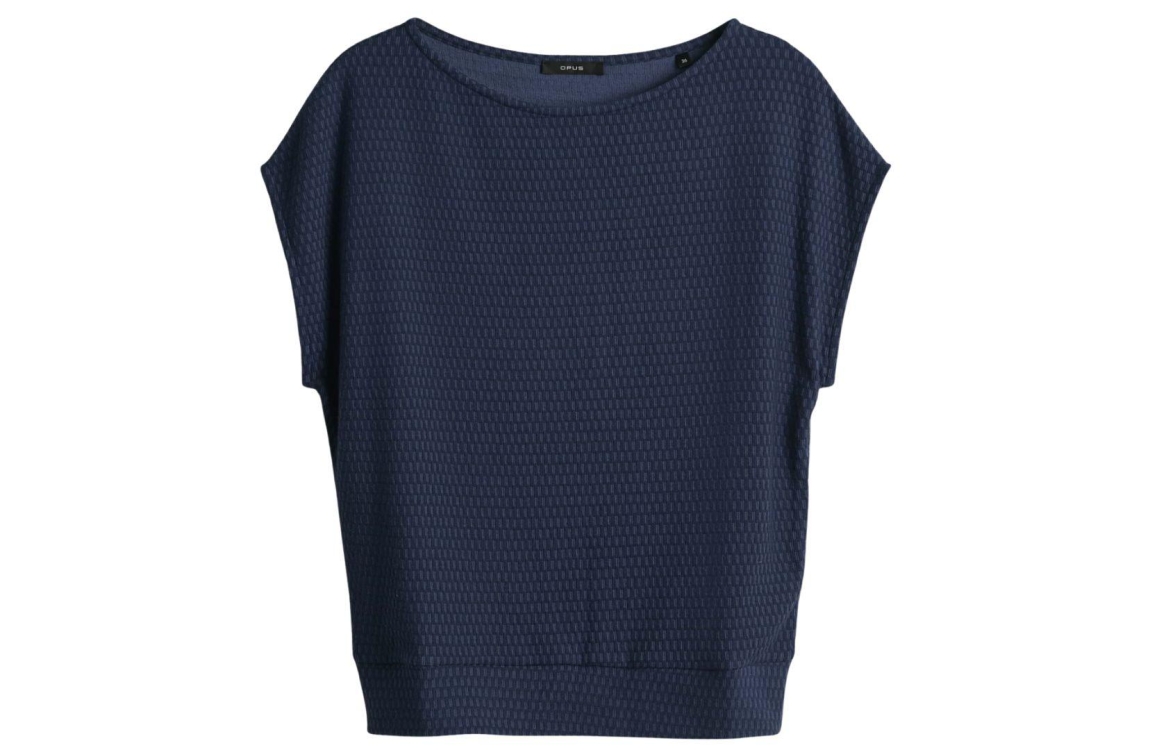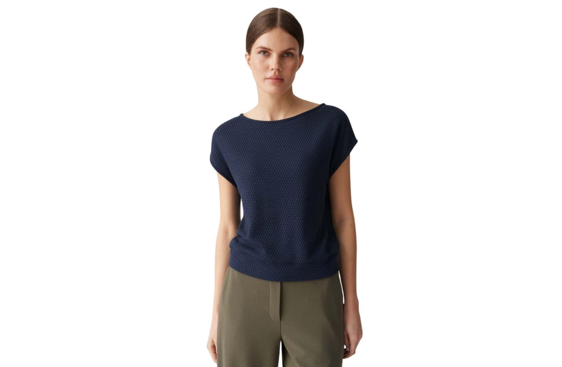 Opus top Sumsala 10443613354366. Dit rechtvallend model heeft een onderzeese halslijn en korte overgesneden mouwen. Deze donkerblauwe top van Opus is uitgevoerd in een elastische stof met een geometrische structuur.