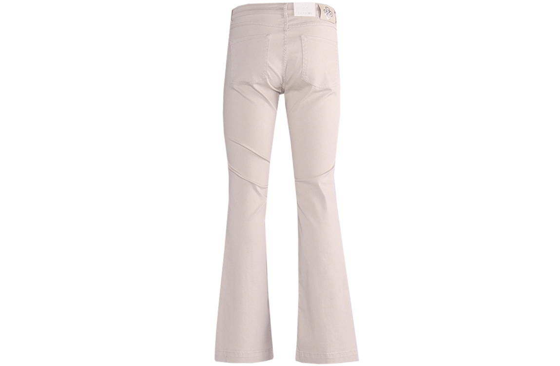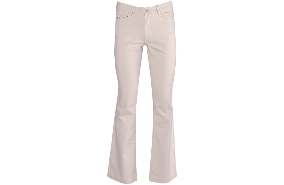 Parami Jade - Color Denim - 637 - Light Ol 202 Stone. Dit flared fit model sluit door middel van een knoop en rits met ceintuurlussen. Deze beige broek van Parami beschikt over steekzakken aan de voor- en achterzijde.