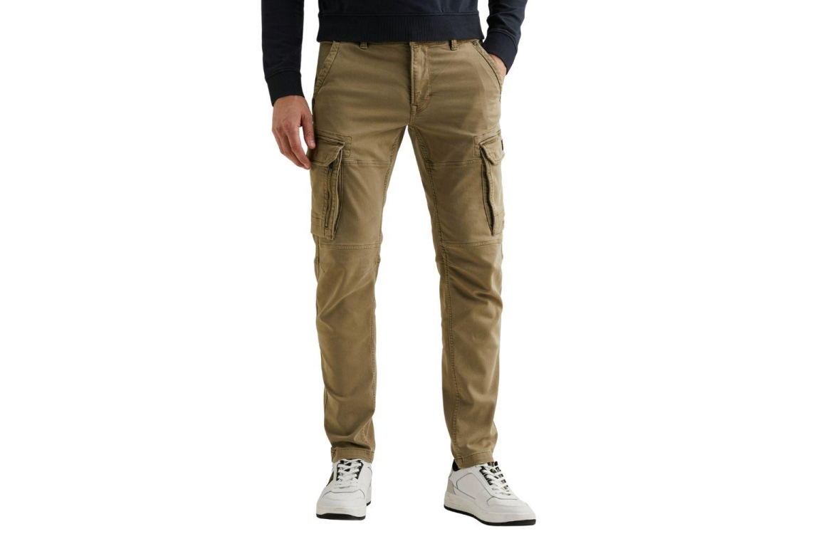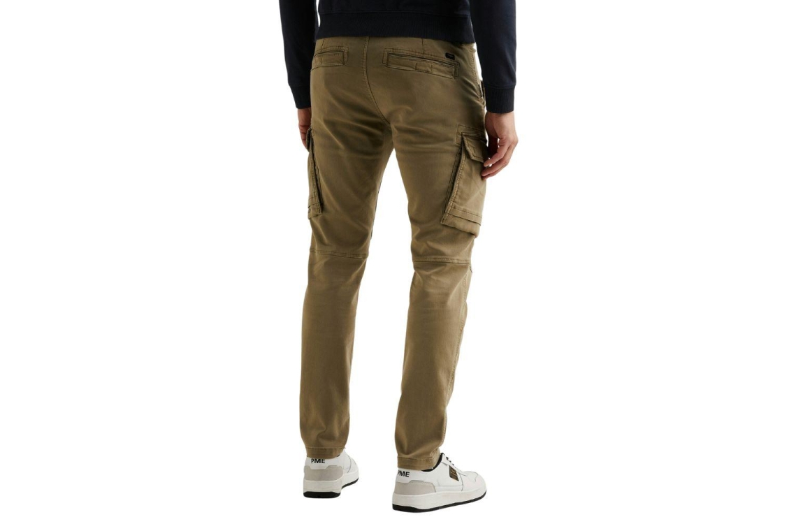 PME Legend broek PTR650001-6405. Dit cargo model is voorzien van een elastische tailleband met trekkoord, een knoop- en ritssluiting en ceintuurlussen. Deze groene broek van PME Legend is voorzien van verschillende zakken en is gedetailleerd met diverse ritsdetails en merkemblemen.
