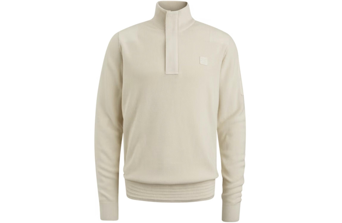 PME Legend trui PKW2309322. Dit rechtvallend model is voorzien van een opstaande kraag en heeft lange mouwen afgewerkt met een zakje op de linkermouw van de drager. Deze créme kleurige trui van PME Legend is geribd uitgevoerd en sluit aan de bovenzijde door middel van een rits en een knoop.