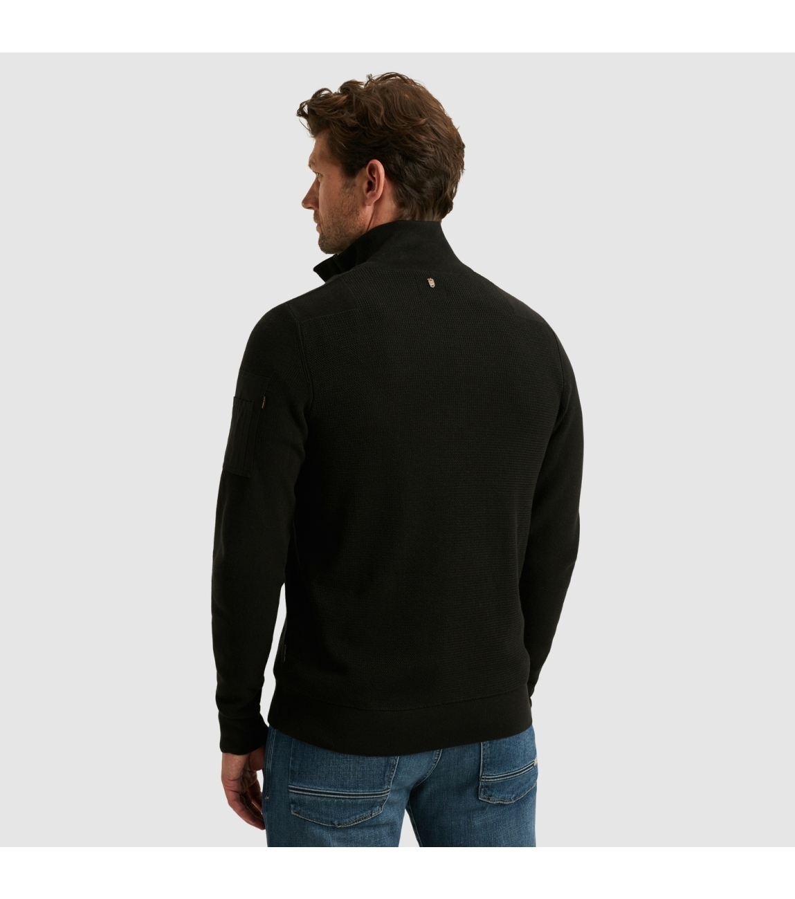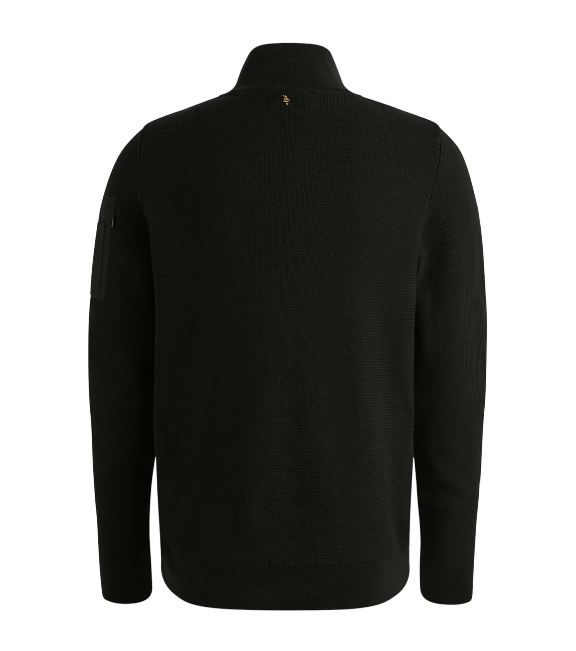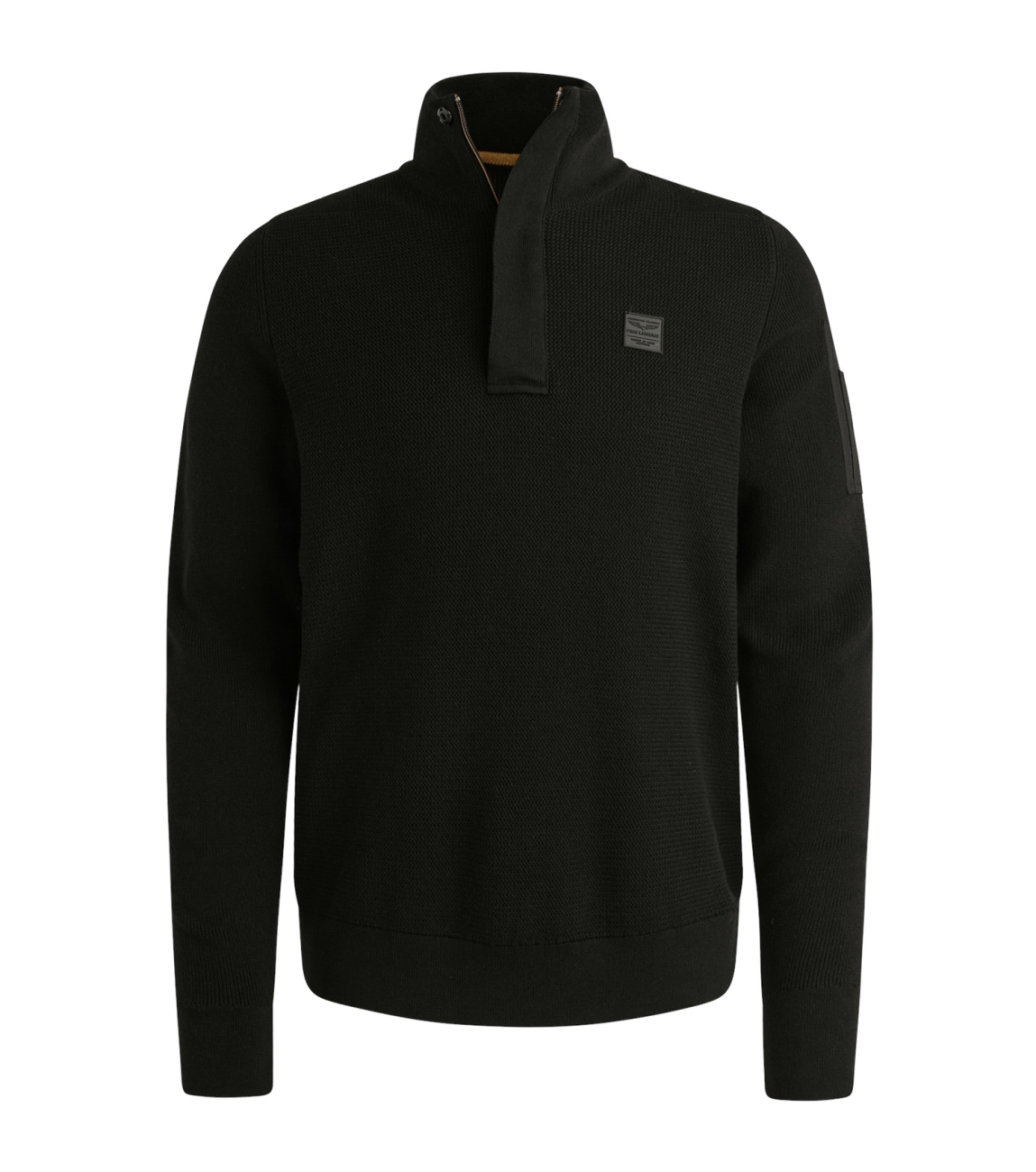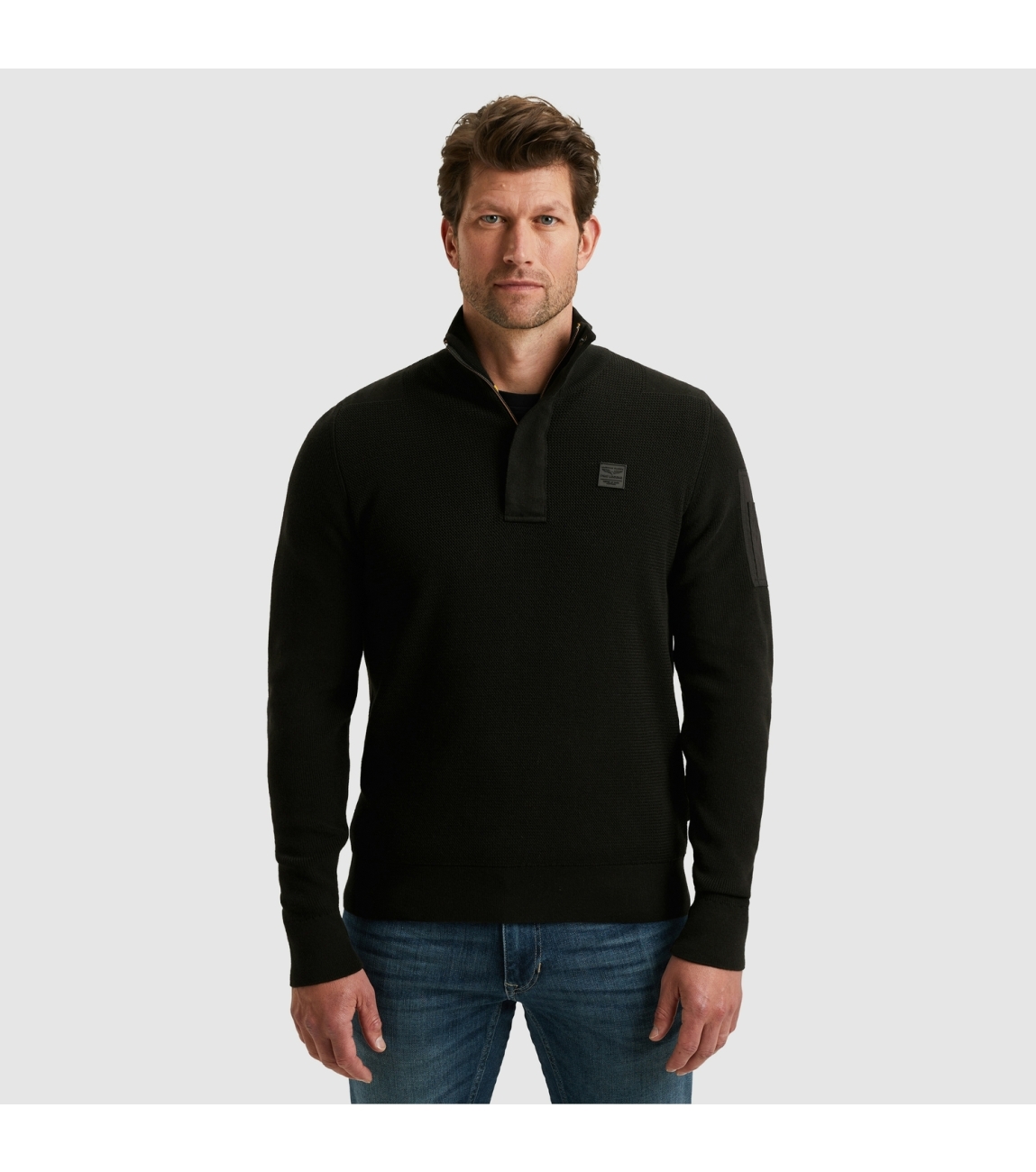 PME Legend pullover pkw2509322. Dit rechtvallend model is voorzien van een opstaande kraag dat sluit door middel van een knoop en rits en heeft lange mouwen. Deze zwarte pullover van PME Legend is afgewerkt met merkembleem aan de voorzijde en een zakje aan de zijkant.