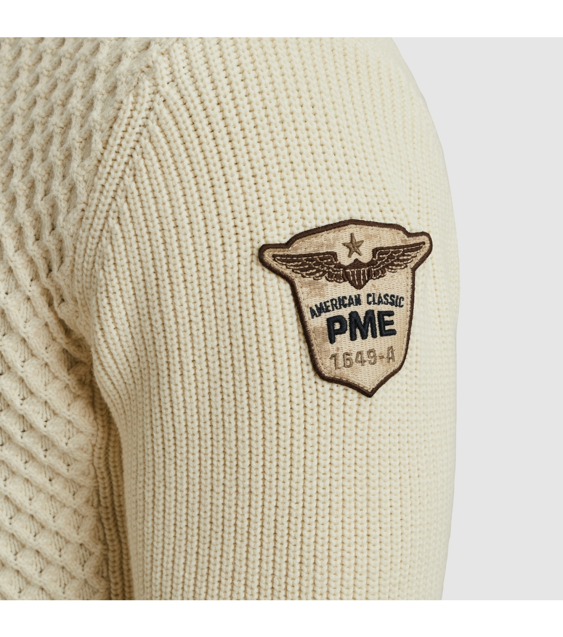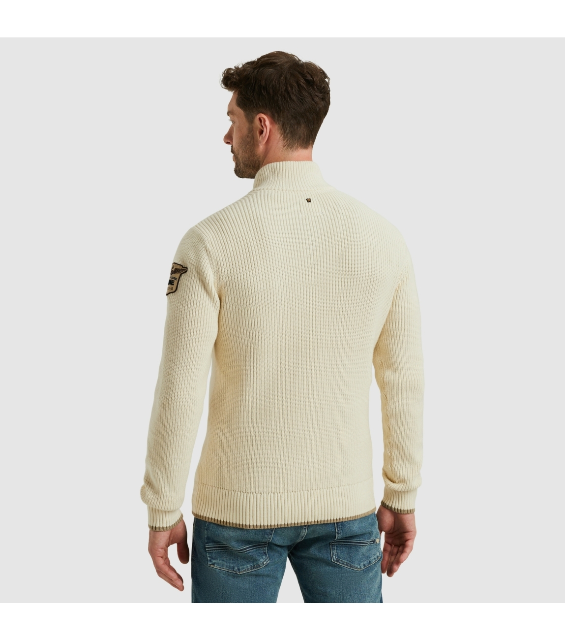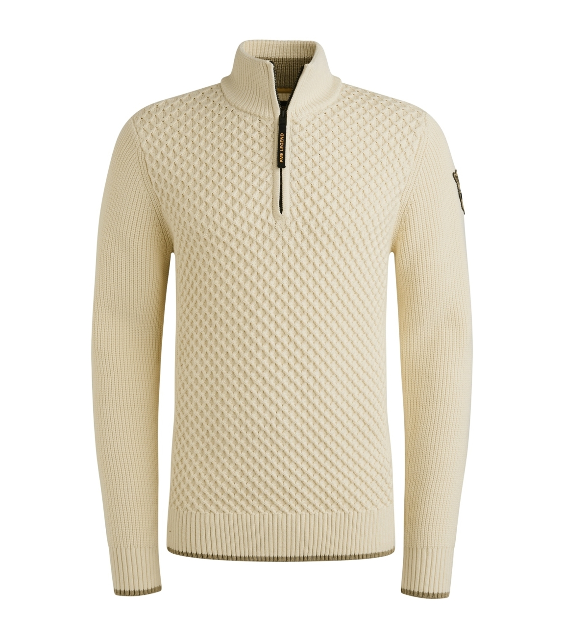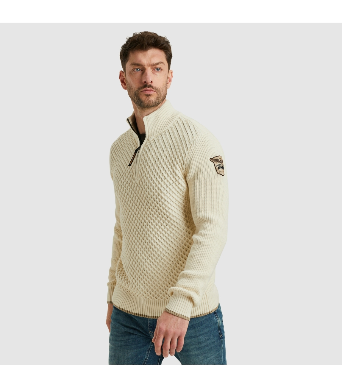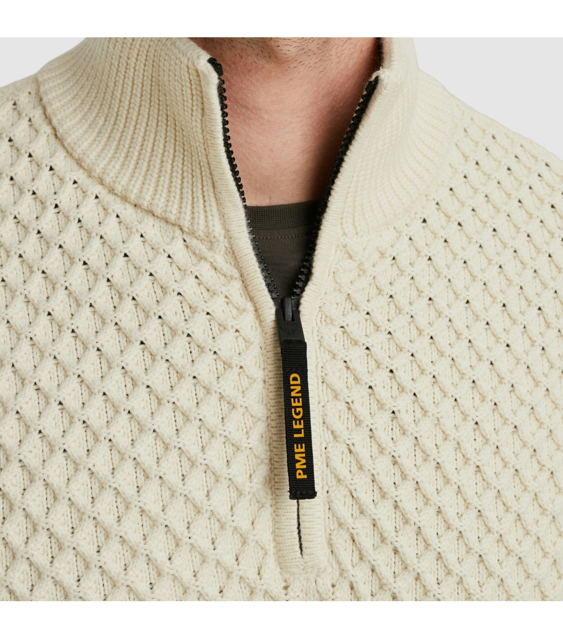 PME Legend Half zip pullover PKW2509324. Het regular fit model heeft een col met rits en lange mouwen. Deze offwhite pullover van PME Legend is uitgevoerd in een grof gebreid materiaal.