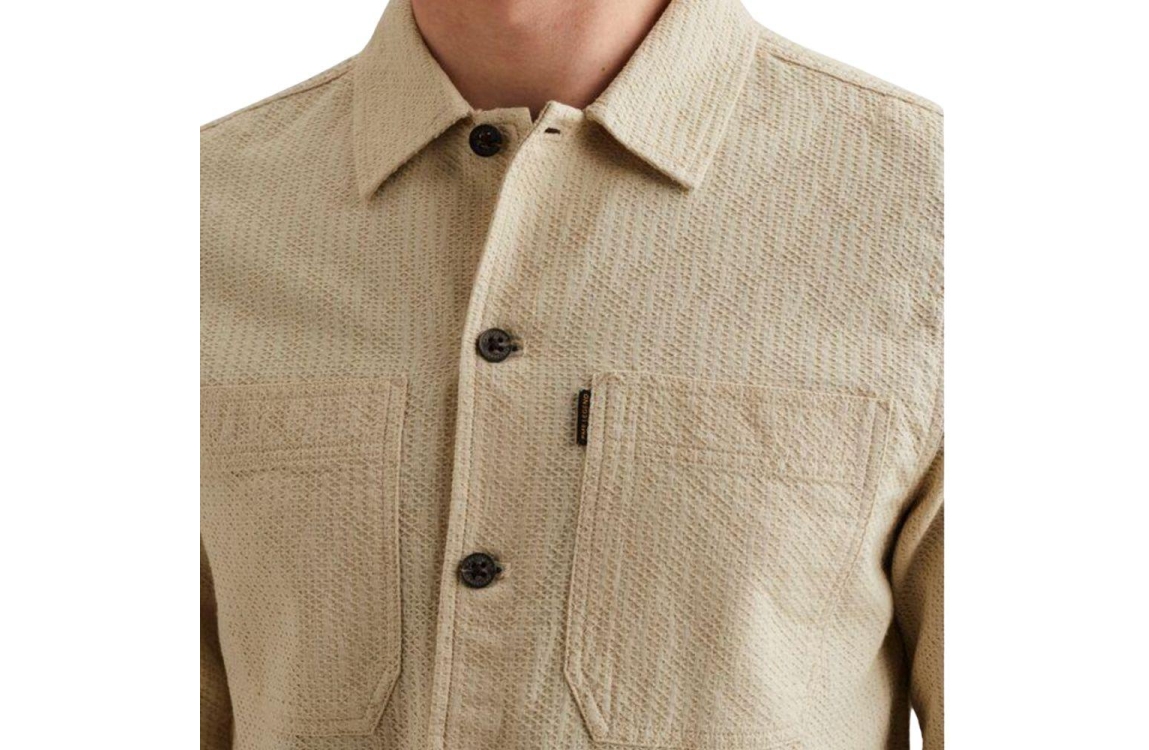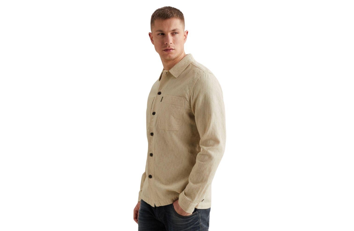 PME Legend overhemd PSI2602222 7013. Dit rechtvallende model heeft een kraag en lange mouwen. Deze beige overhemd van PME Legend sluit aan de voorzijde door middel van knopen en is all-over bewerkt met een structuur. Het model is voorzien van twee borstzakken, gedetailleerd met het merkembleem.