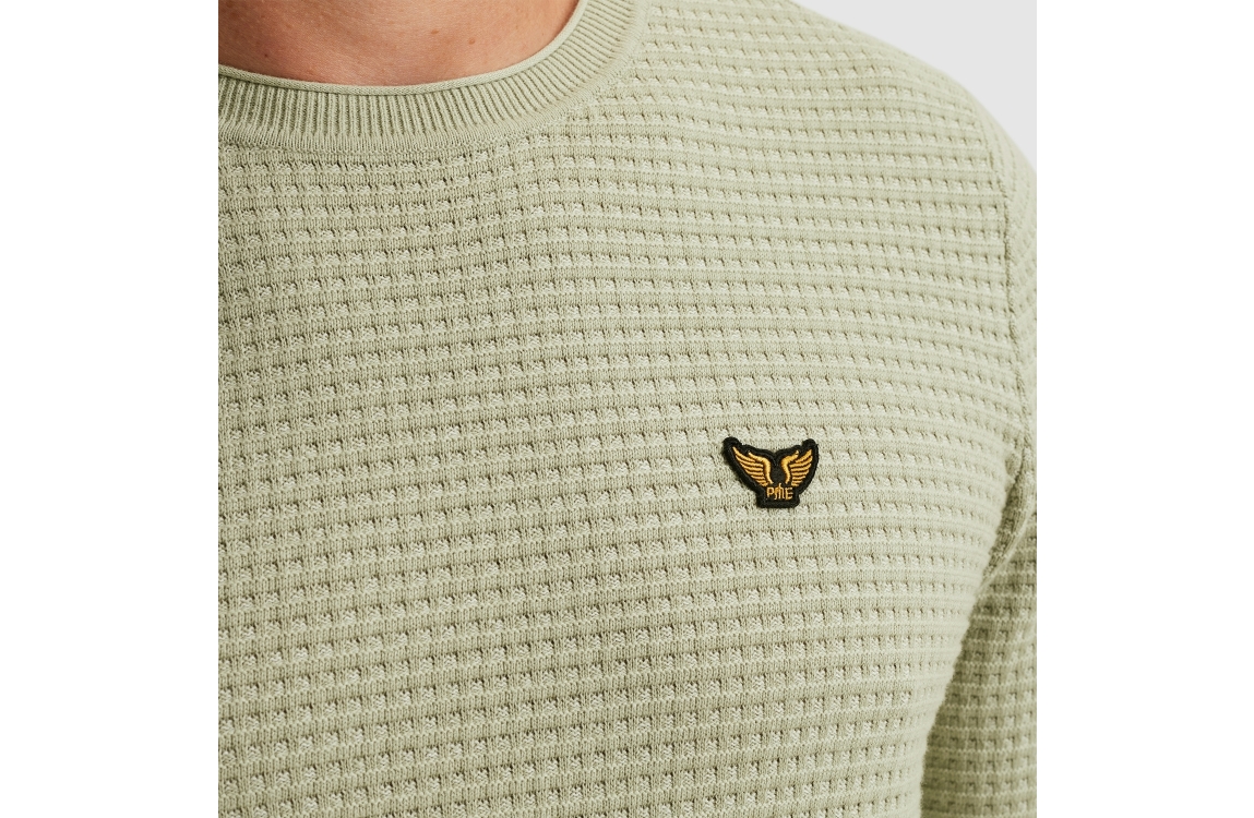 PME Legend trui PKW2511330 6163. Dit rechtvallende model heeft een ronde halslijn en lange mouwen. Deze lichtgroene trui van PME Legend is all-over bewerkt met een structuur en is op de linkerborst gedetailleerd met het merkembleem. Het model is afgewerkt met ribgebreide boorden.