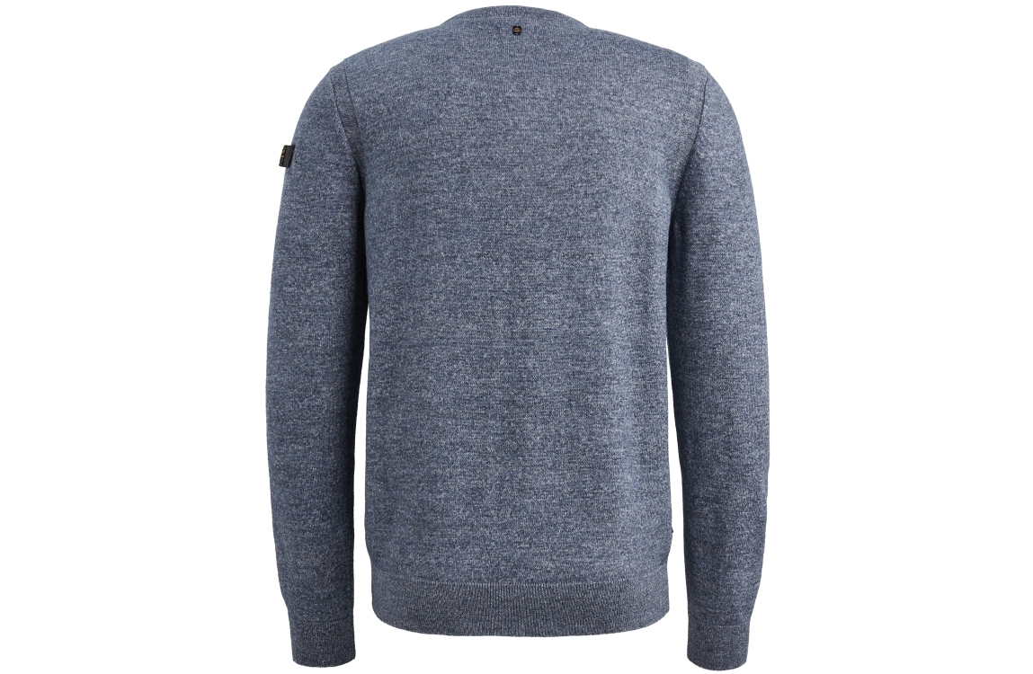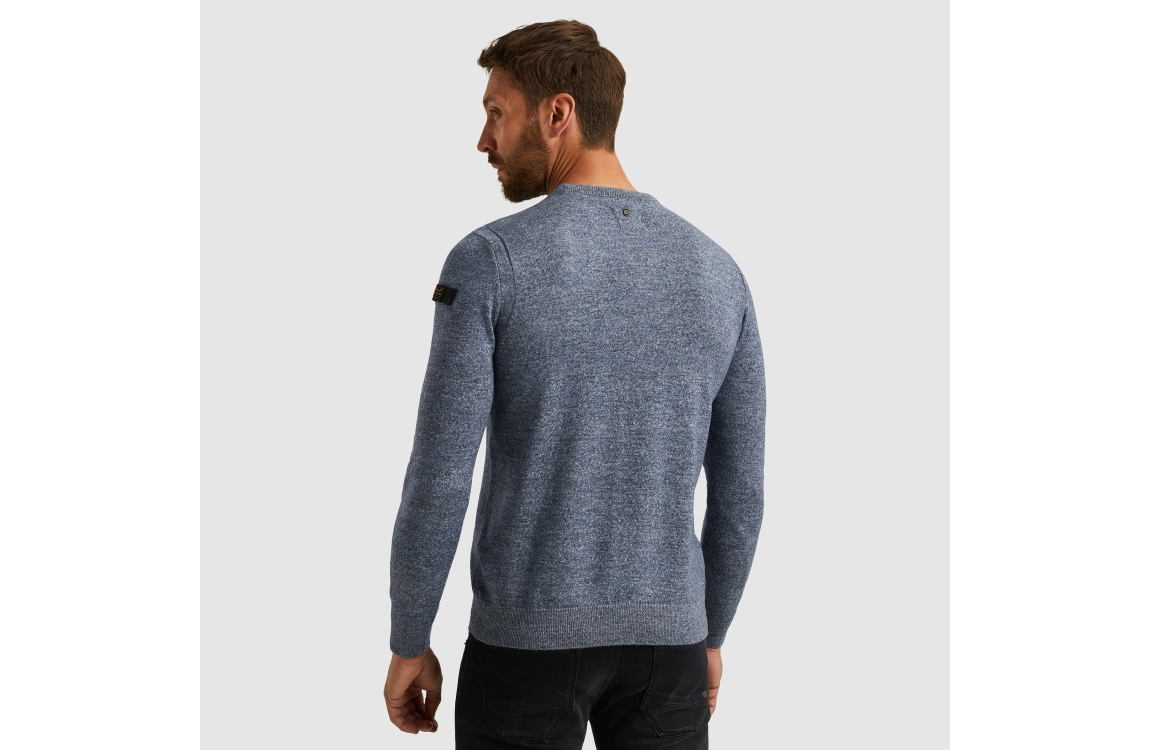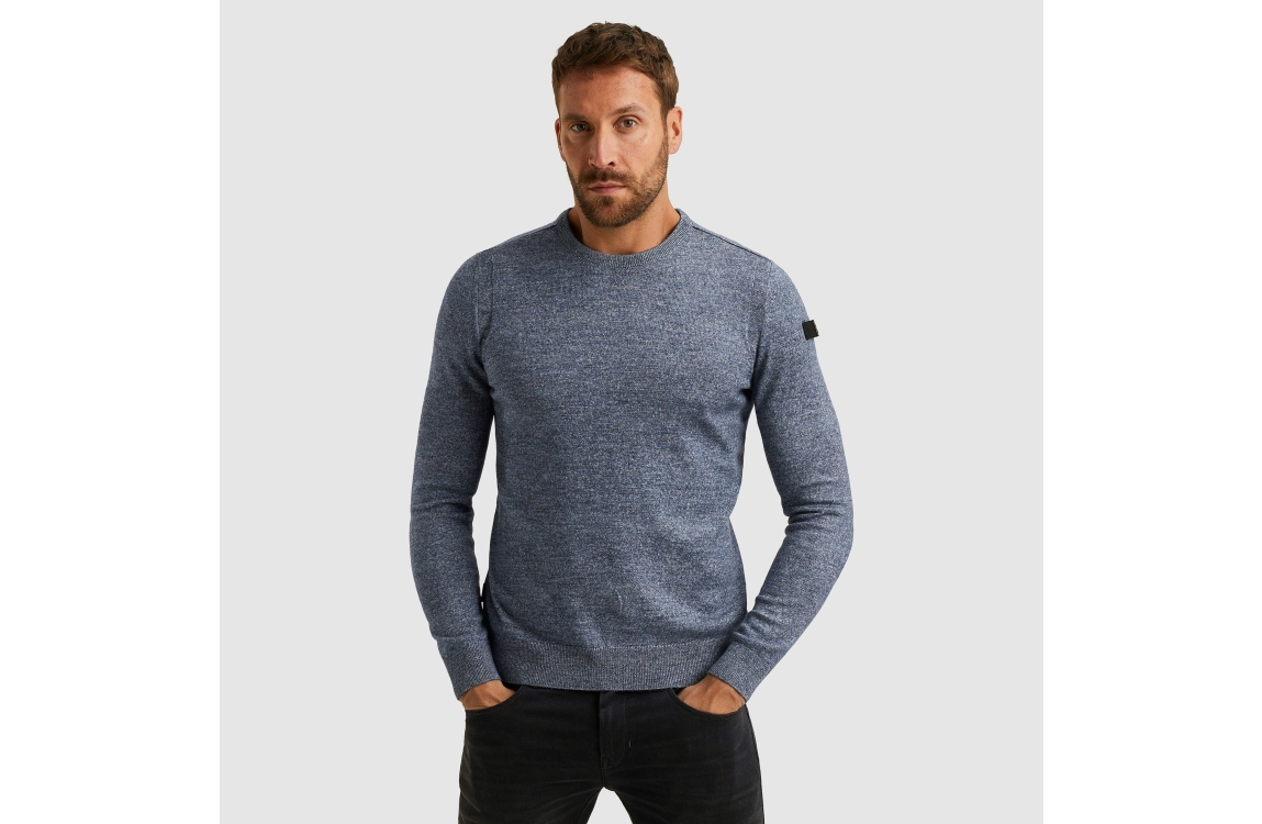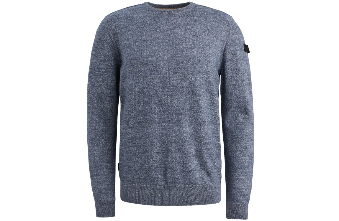 PME Legend trui PKW2511335 5299. Dit rechtvallende model heeft een ronde halslijn en lange mouwen. Deze donkerblauwe trui van PME Legend is op de linkermouw gedetailleerd met een merkembleem en is afgewerkt met ribgebreide boorden.