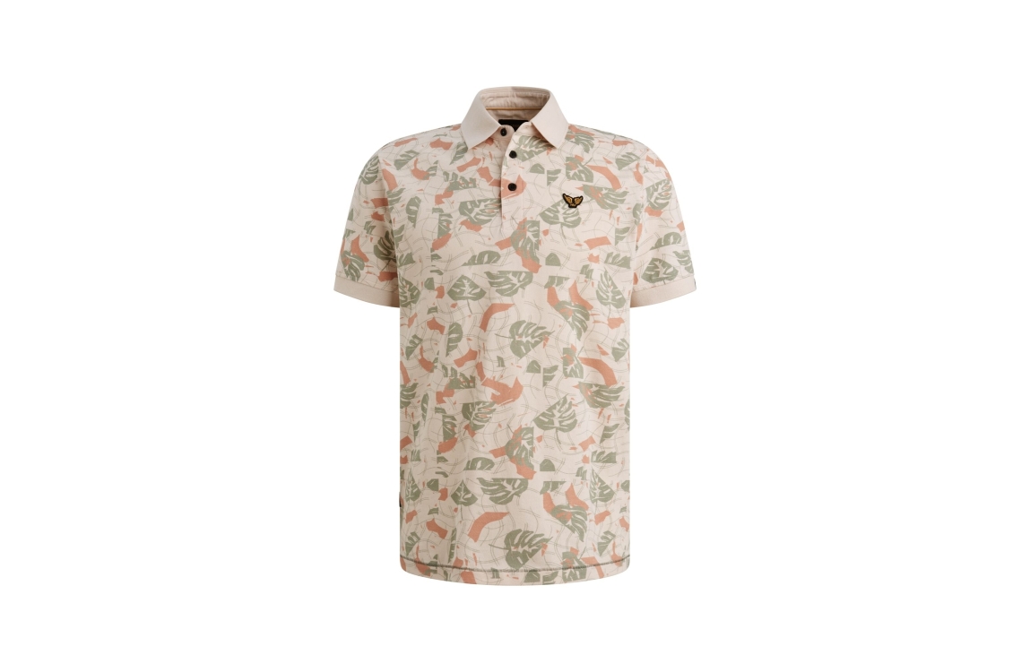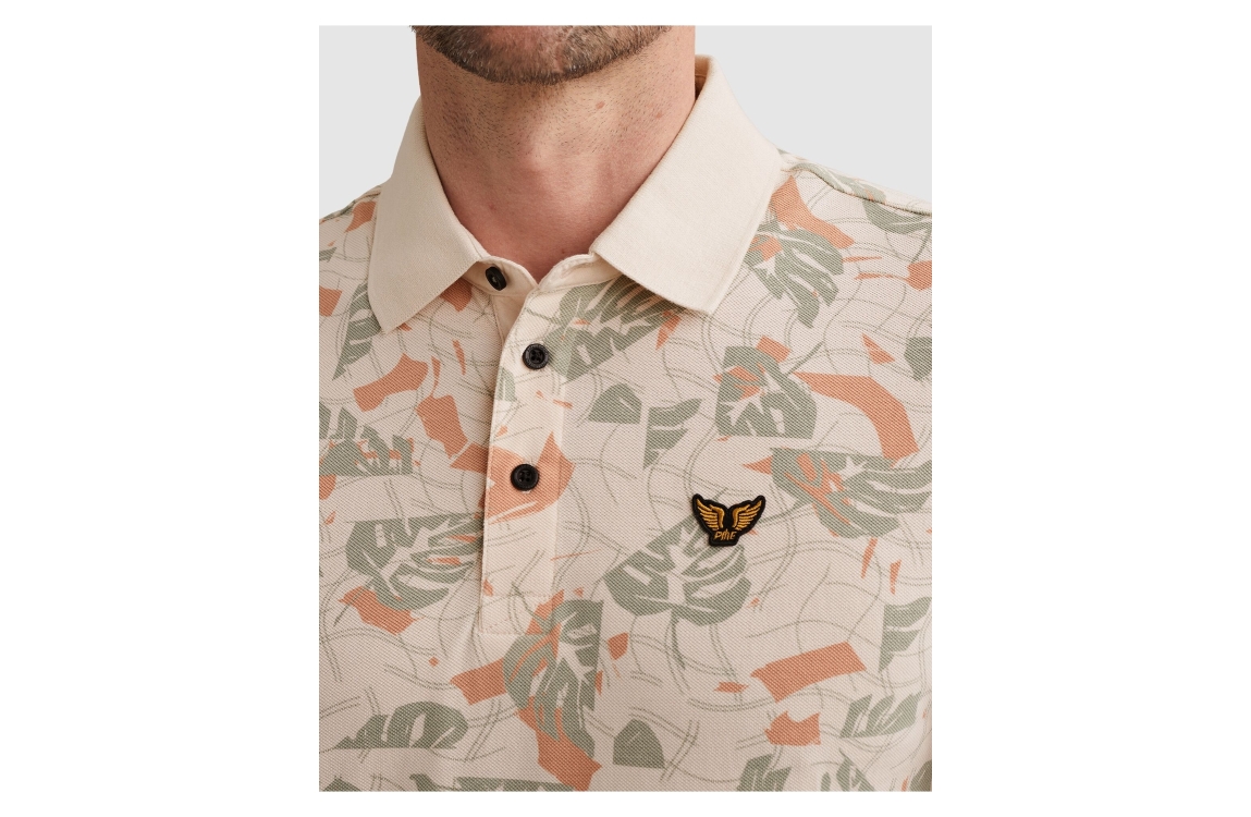 PME Legend short sleeve polo PPSS2604879. Dit regular fit model is voorzien van een kraag en heeft korte mouwen. Deze roze polo van PME Legend sluit door middel van knopen en is bewerkt met een groene bladprint.