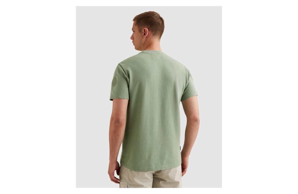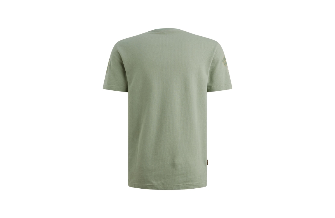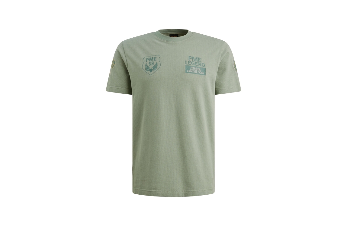 PME Legend short sleeve r-neck flat waffle PTSS2604576. Dit rechtvallend model is voorzien van een ronde hals en heeft korte mouwen. Deze groene T-shirt van PME Legend is bewerkt met een structuur all-over en is afgewerkt met logo emblemen.