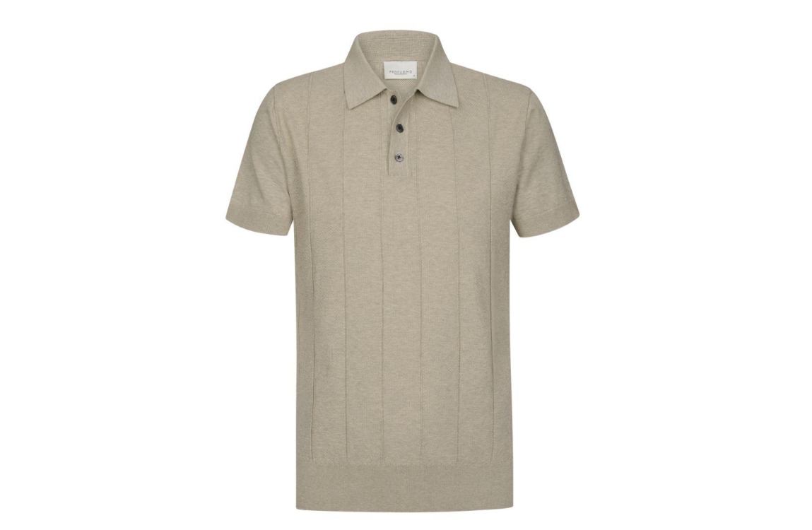 Profuomo polo PPXD10030E. Dit rechtvallend model is voorzien van een kraag en heeft korte mouwen. Deze beige polo van Profuomo sluit door middel van knopen en is uitgevoerd in een structuur.