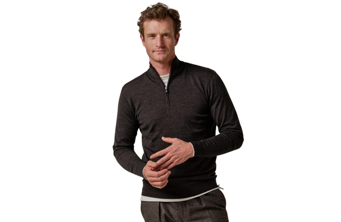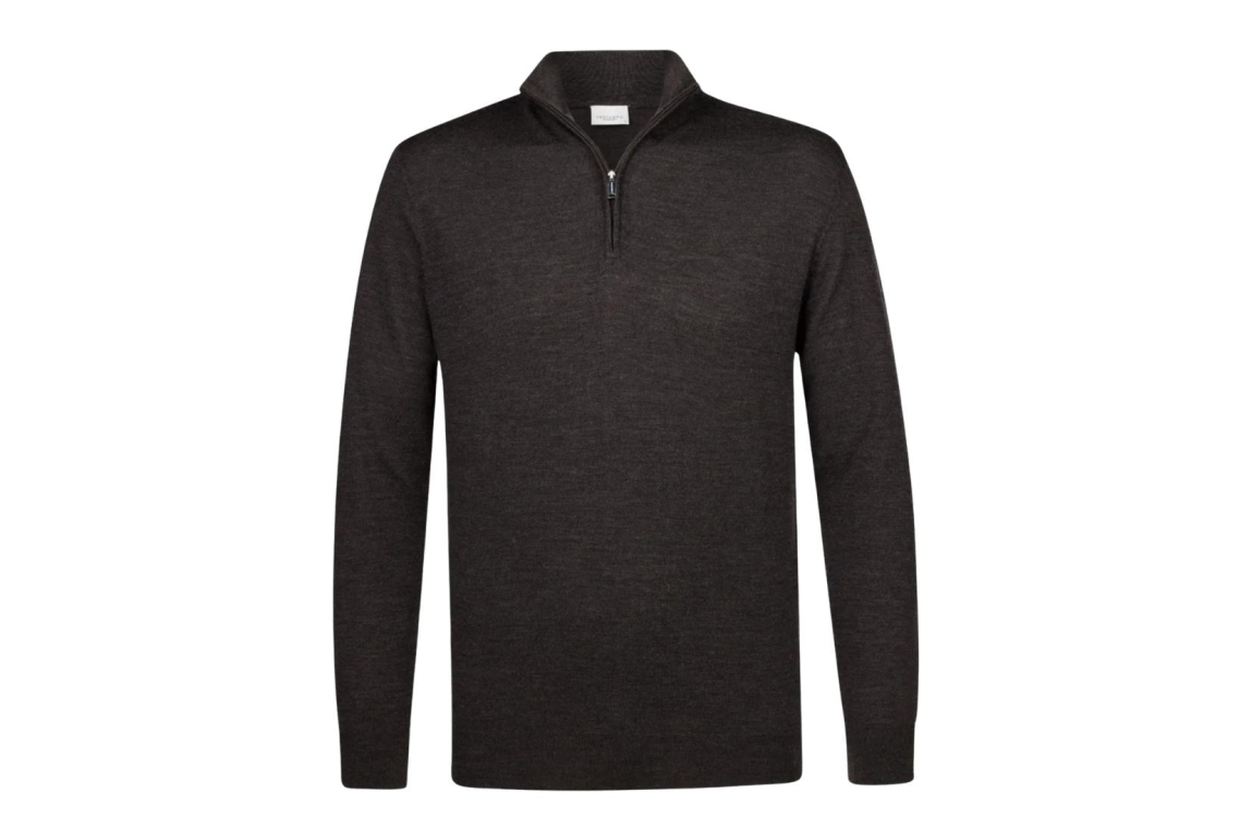 Profuomo pullover PP2J00012C. Dit rechtvallende model heeft een opstaande kraag met ritssluiting en lange mouwen. Deze donkerbruine pullover van Profuomo is uitgevoerd in een fijn breisel en is afgewerkt met ribgebreide boorden.
