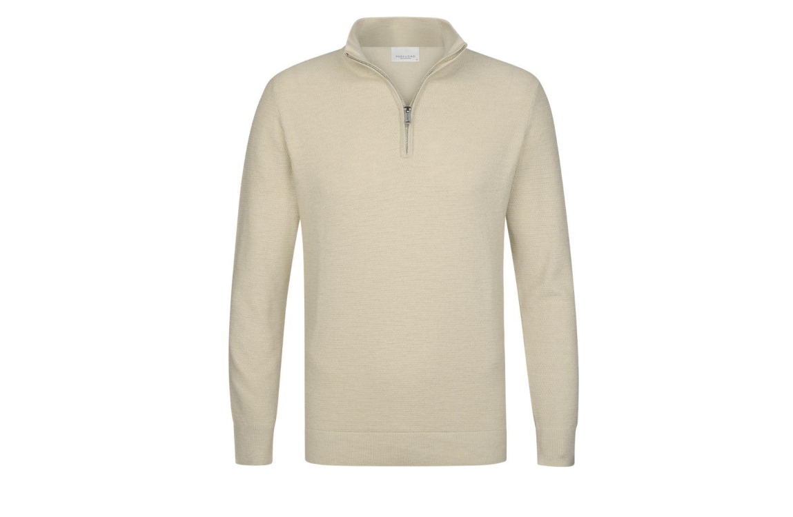 Profuomo pullover halfzip PP2J00010C. Dit rechtvallend model is voorzien van een opstaande kraag en heeft. lange mouwen. Deze beige pullover sluit door middel van een rits en is uitgevoerd in een gehaakte fijne structuur.